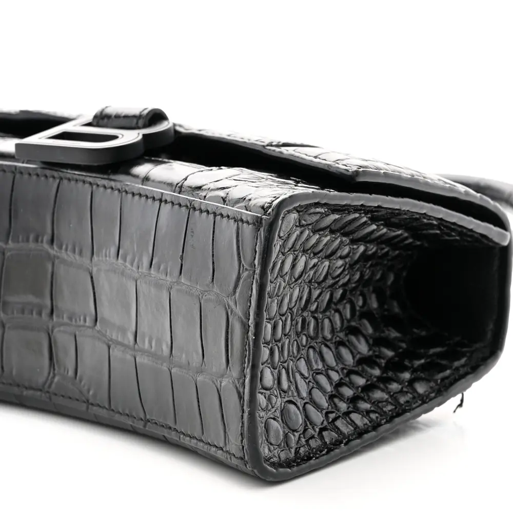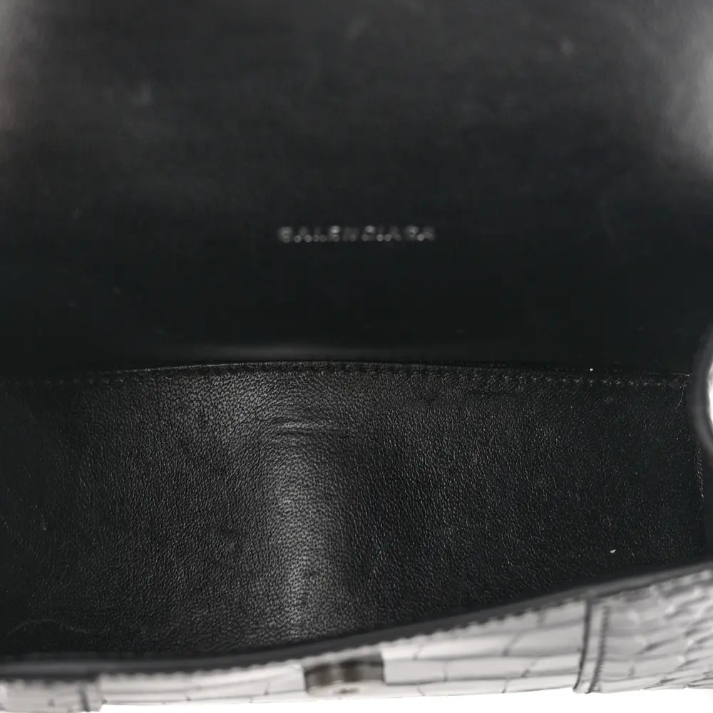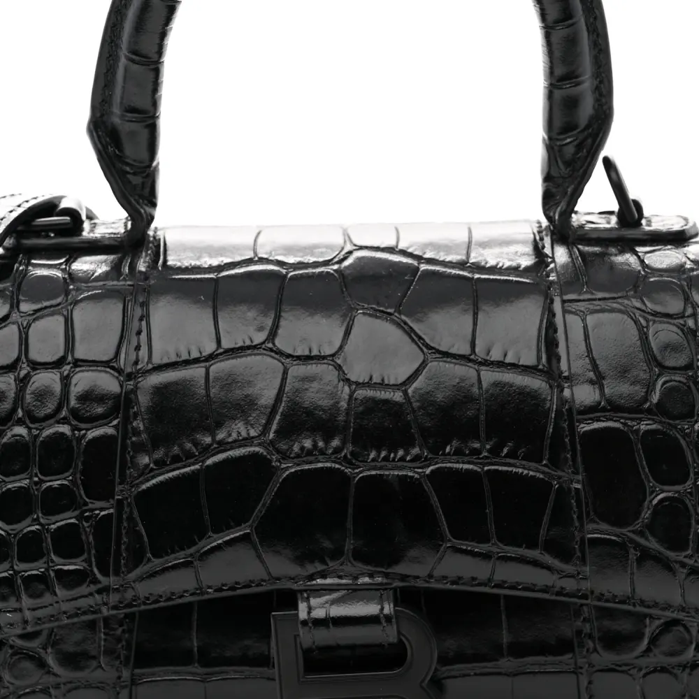 Balenciaga XS Hourglass Top Handle Bag Black Monochrome Crocodile Embossed Shiny Calfskin Leather Black Hardware