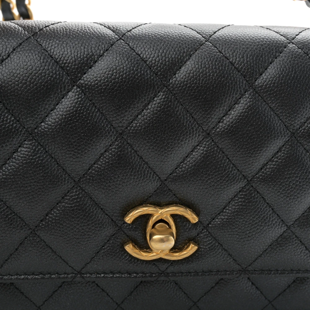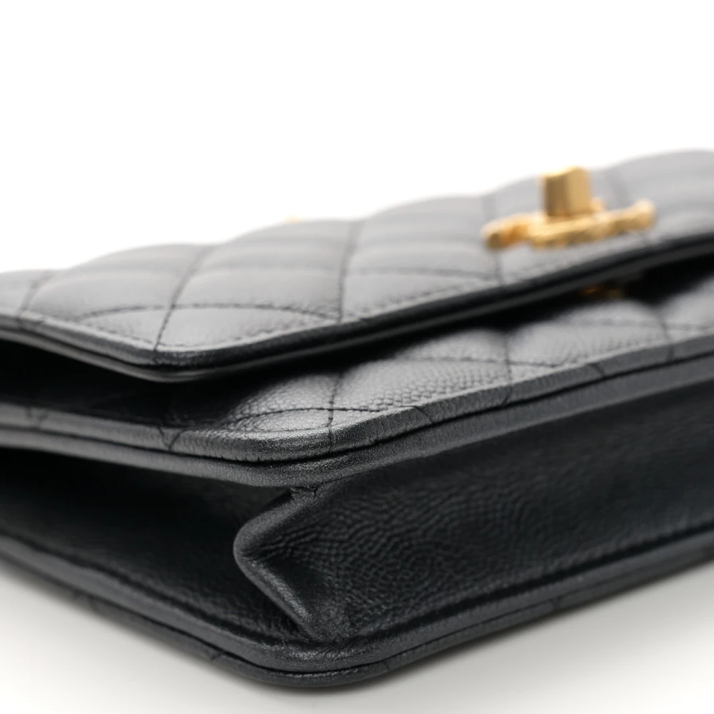 This Chanel CC Quilted Wallet On Chain (WOC) Small in Black Quilted Pearly Caviar Leather with Aged Gold Hardware is a sophisticated accessory. The pearly caviar leather adds a subtle shine to its iconic quilted design. Aged gold hardware enhances its vintage appeal. Compact yet practical, ideal for carrying essentials like cards and cash. The chain strap offers versatile styling options. A timeless piece for any Chanel collection.
