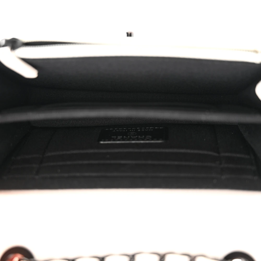 This Chanel Trendy CC Wallet On Chain (WOC) Mini in White Quilted Lambskin Leather features black hardware. The compact and sleek design makes it perfect for carrying essentials. The soft lambskin leather provides a polished and luxurious feel. Ideal for transitioning from day to night. A stylish and practical piece for modern fashionistas. A classic Chanel accessory with a trendy twist.