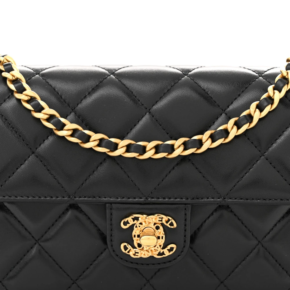his Chanel Flap Clutch Small in Black Quilted Shiny Lambskin Leather with Gold Hardware is a sophisticated and versatile piece. The shiny lambskin leather adds a touch of glamour to its classic design. Gold hardware enhances its luxurious appeal. Compact yet spacious enough for essentials, perfect for evening outings. The flap closure combines elegance with functionality. A timeless addition to any Chanel wardrobe.
