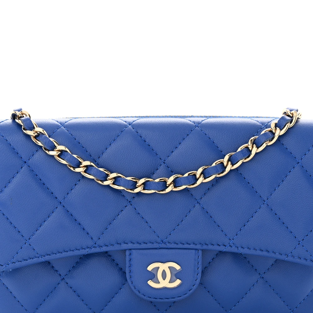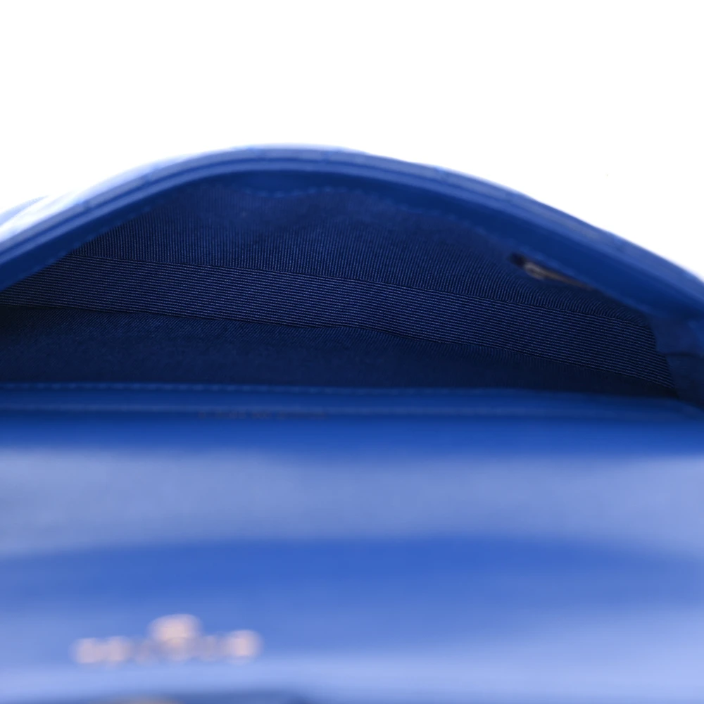 This Chanel Phone Holder With Chain Small in Blue Quilted Lambskin Leather with Flap and Light Gold Hardware is a chic and functional piece. The soft lambskin leather and quilted design showcase timeless Chanel craftsmanship. Light gold hardware complements its sleek and elegant look, perfect for any outfit. Compact yet practical, it fits your phone and small essentials with ease. The chain strap provides hands-free versatility for busy days. A stylish solution for staying connected on the go.