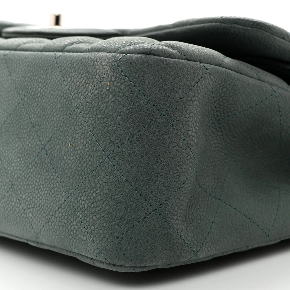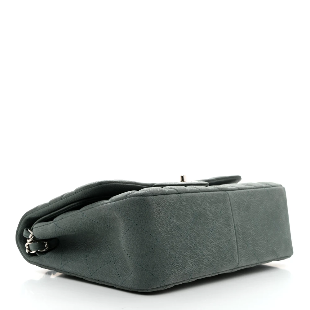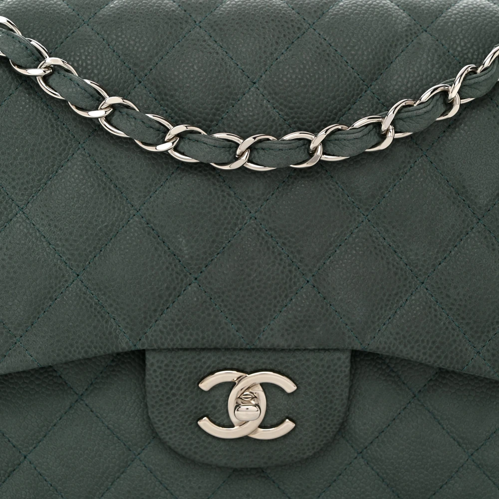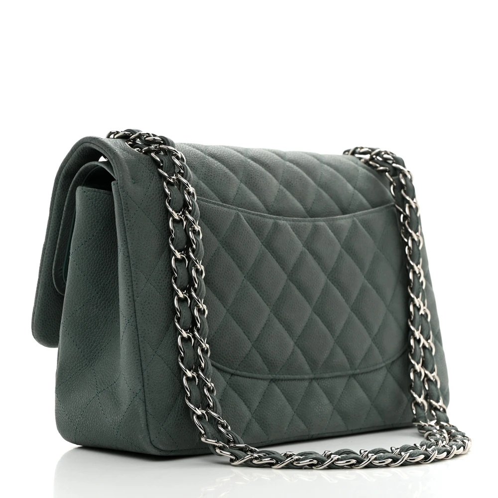 This Chanel Double Flap Jumbo in Green Quilted Caviar Leather with Silver Hardware is a stunning and timeless accessory. The durable caviar leather provides a rich texture, while the green hue adds a modern twist. Silver hardware complements the quilted design, enhancing its elegance. Spacious enough for daily essentials,  versatile for various occasions. A timeless addition to any wardrobe. A must-have for Chanel lovers.