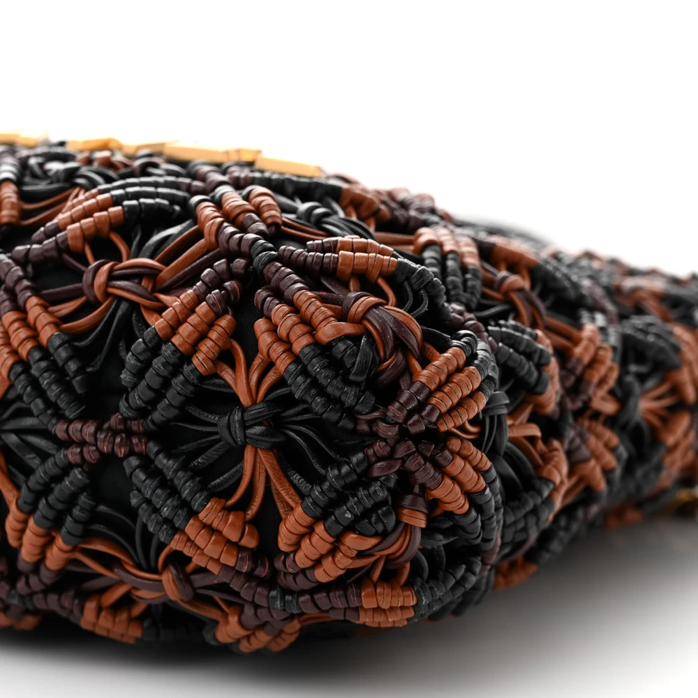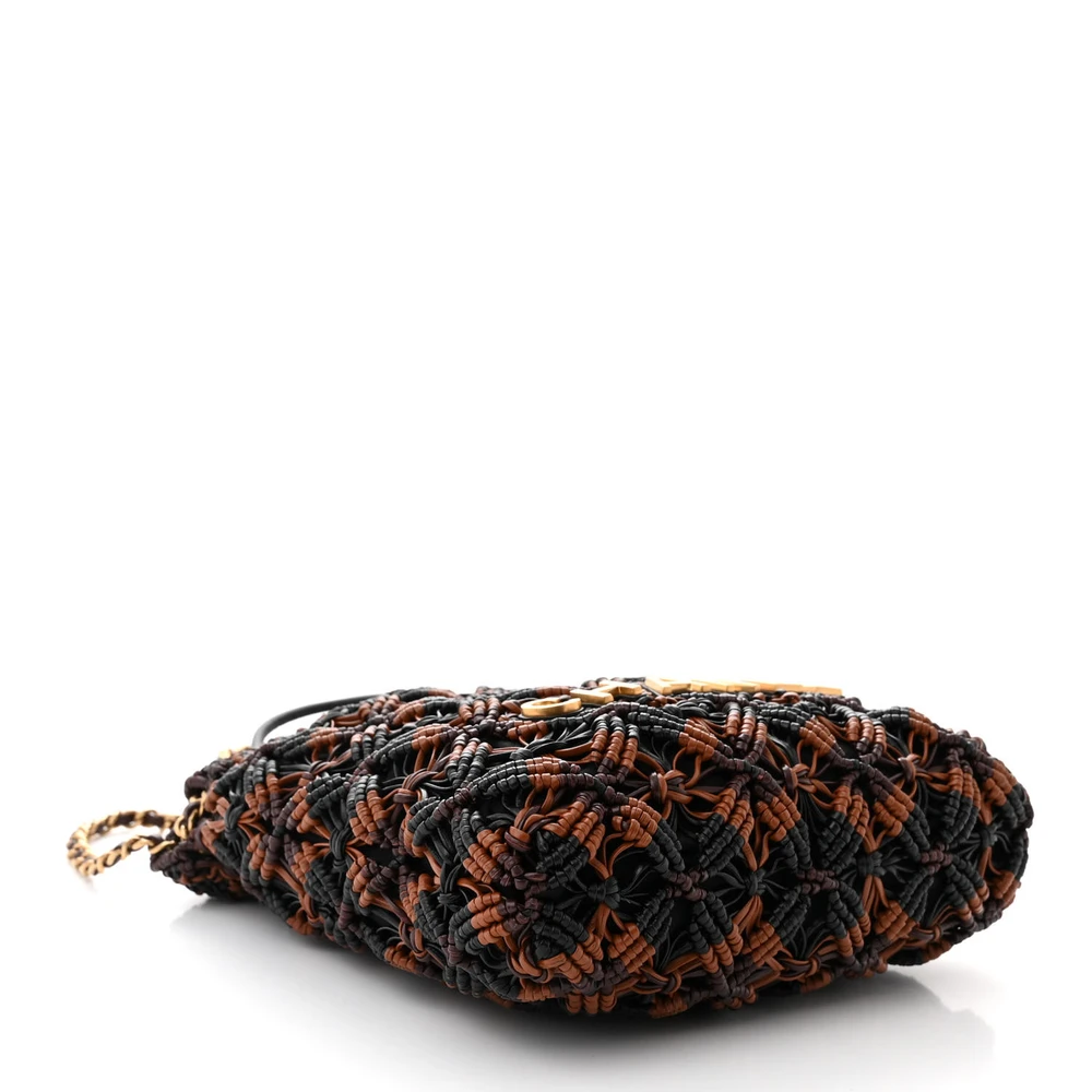 This Chanel Mini Black/Light Brown/Burgundy Chanel 22 is crafted from calfskin leather with macrame detailing. The aged gold hardware complements its unique and artistic design. Spacious yet compact, perfect for carrying essentials. The macrame detail adds texture and interest. A standout accessory for elevating any outfit. A unique and bold piece for Chanel enthusiasts.