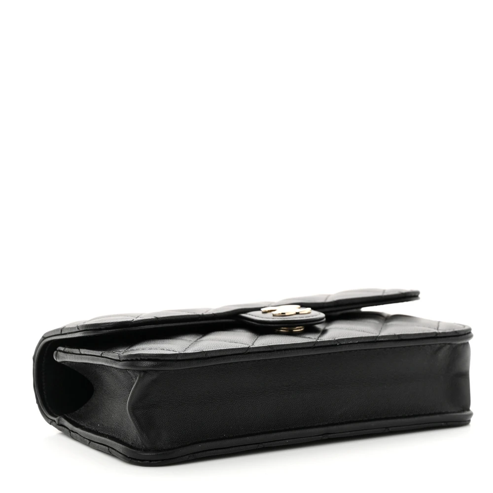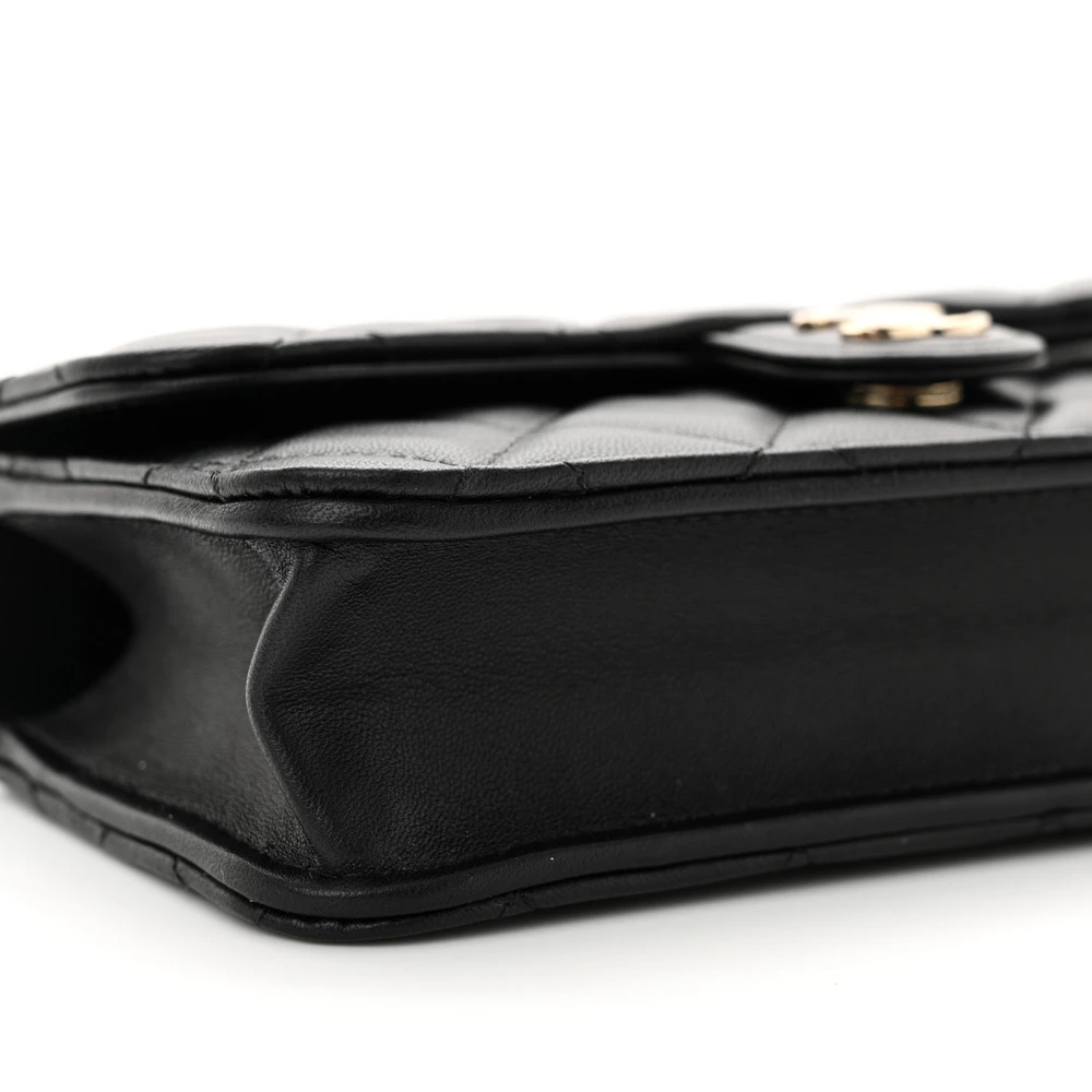 This Chanel Flap Phone Holder With Chain Small in Black Quilted Lambskin Leather features light gold hardware. The sleek and compact design is ideal for carrying essentials with ease. Its luxurious lambskin leather offers a soft and elegant finish. Perfect for both casual outings and evening events. The chain strap adds versatility and style. A must-have accessory for Chanel lovers.
