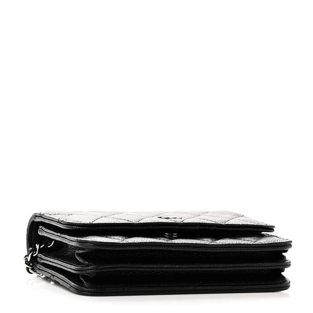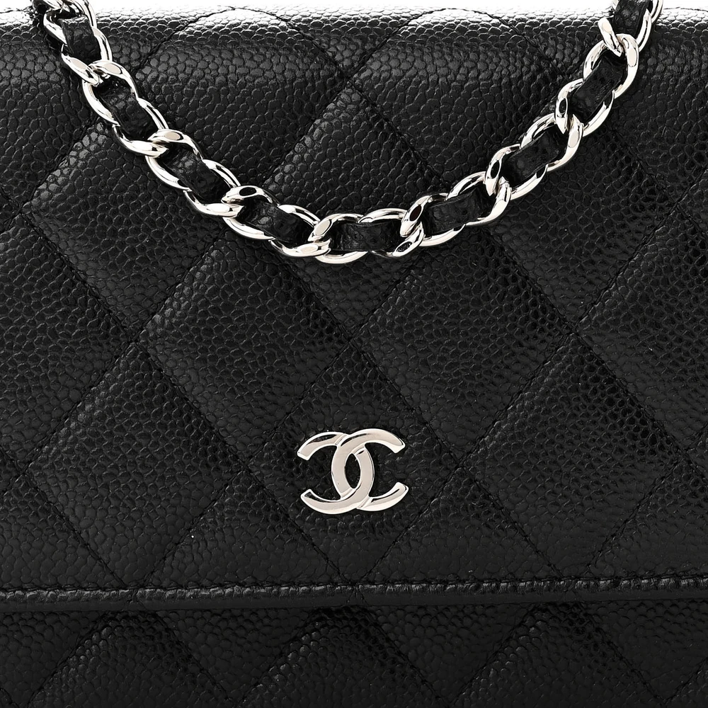 This Chanel Wallet On Chain (WOC) Mini in Black Quilted Caviar Leather with Silver Hardware is a compact and classic piece. The caviar leather ensures durability while maintaining its luxurious appeal. Silver hardware complements its quilted design, adding a refined touch. Perfect for on-the-go lifestyles, it features a secure closure and organized compartments. The chain strap allows for versatile wear, from crossbody to clutch. A timeless accessory for any occasion.