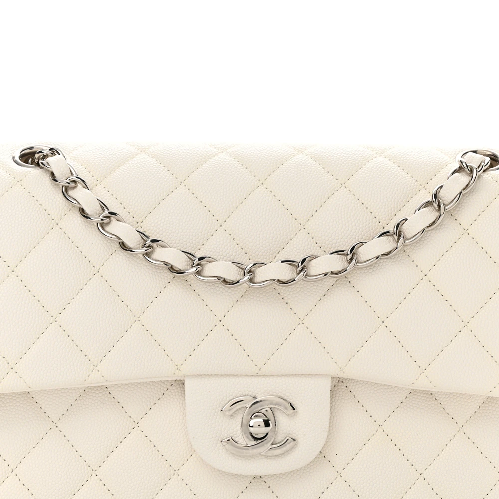This Chanel Double Flap Medium in White Quilted Caviar Leather features silver hardware. The sleek and elegant design makes it versatile for any occasion. Spacious enough for essentials, perfect for both day and evening wear. The durable caviar leather ensures longevity and a polished finish. A classic and timeless piece for a sophisticated wardrobe. A must-have for Chanel lovers.