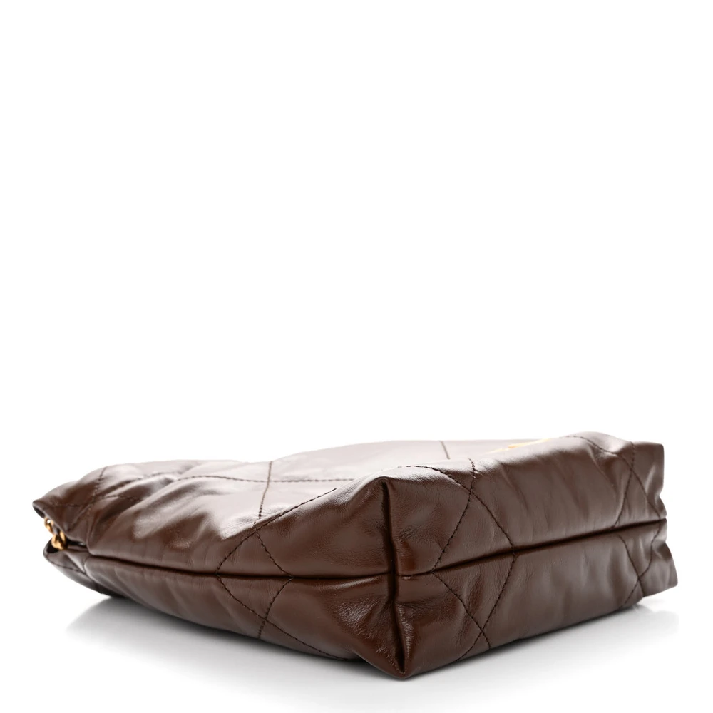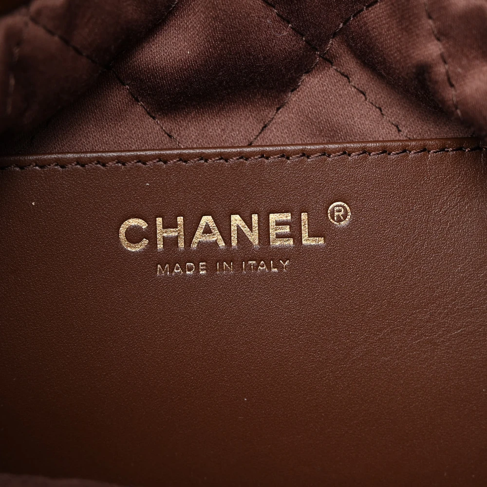This Chanel Chanel 22 Mini in Brown Quilted Shiny Calfskin Leather with Gold Hardware combines elegance with contemporary design. The shiny calfskin leather exudes a polished look, while the quilted pattern adds a classic Chanel touch. Gold hardware enhances its sophisticated charm, perfect for versatile wear. The mini size is ideal for carrying essentials with ease. A drawstring closure introduces a playful yet functional element. A stylish piece for those who appreciate understated luxury.