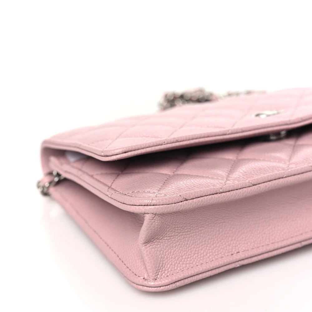 This Chanel Wallet On Chain (WOC) Small in Light Pink Quilted Caviar Leather with Silver Hardware is a delicate and stylish accessory. The soft pink hue is complemented by Chanel durable quilted caviar leather. Silver hardware adds a sleek and modern contrast to its feminine design. Compact and functional, it offers organized compartments for essentials. The chain strap provides versatile carrying options. A chic piece for day or evening wear.