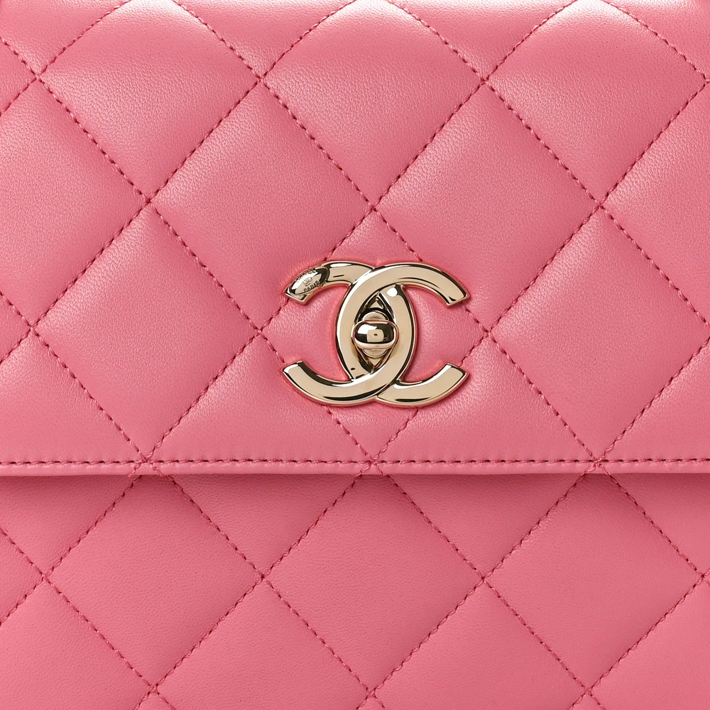 This Chanel Trendy CC Flap Small in Pink Quilted Lambskin Leather with Dual Handles and Light Gold Hardware is a feminine and refined design. The soft lambskin leather and quilted pattern reflect Chanel iconic sophistication. Light gold hardware enhances its elegant aesthetic, making it perfect for various occasions. Dual top handles provide versatility and functionality for day or evening wear. The compact interior is practical for essentials, ensuring effortless organization. A charming addition to elevate any collection.