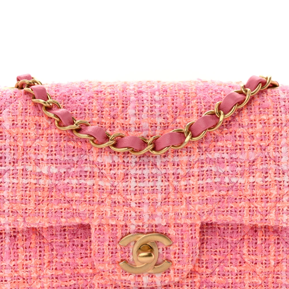 This Chanel Mini Rectangular Flap in Pink Multicolor Quilted Tweed with Gold Hardware is a vibrant and feminine accessory. The multicolor tweed adds a playful touch, while the gold hardware lends a luxurious finish. Its compact size is perfect for carrying small essentials, making it ideal for day-to-evening wear. The signature CC turn-lock closure and chain strap complete its iconic look. A chic piece that blends timeless design with modern flair. A must-have for Chanel lovers seeking a pop of color.