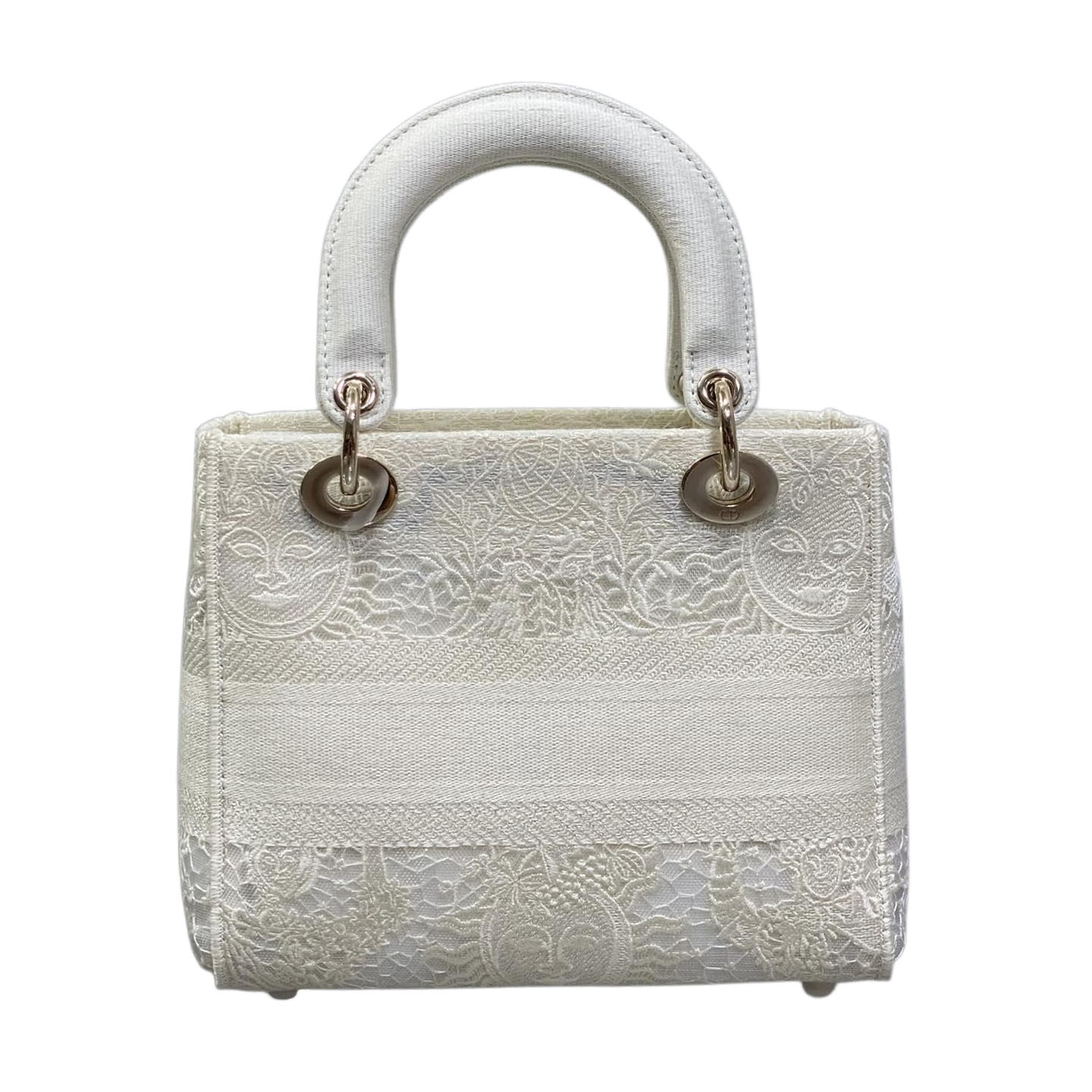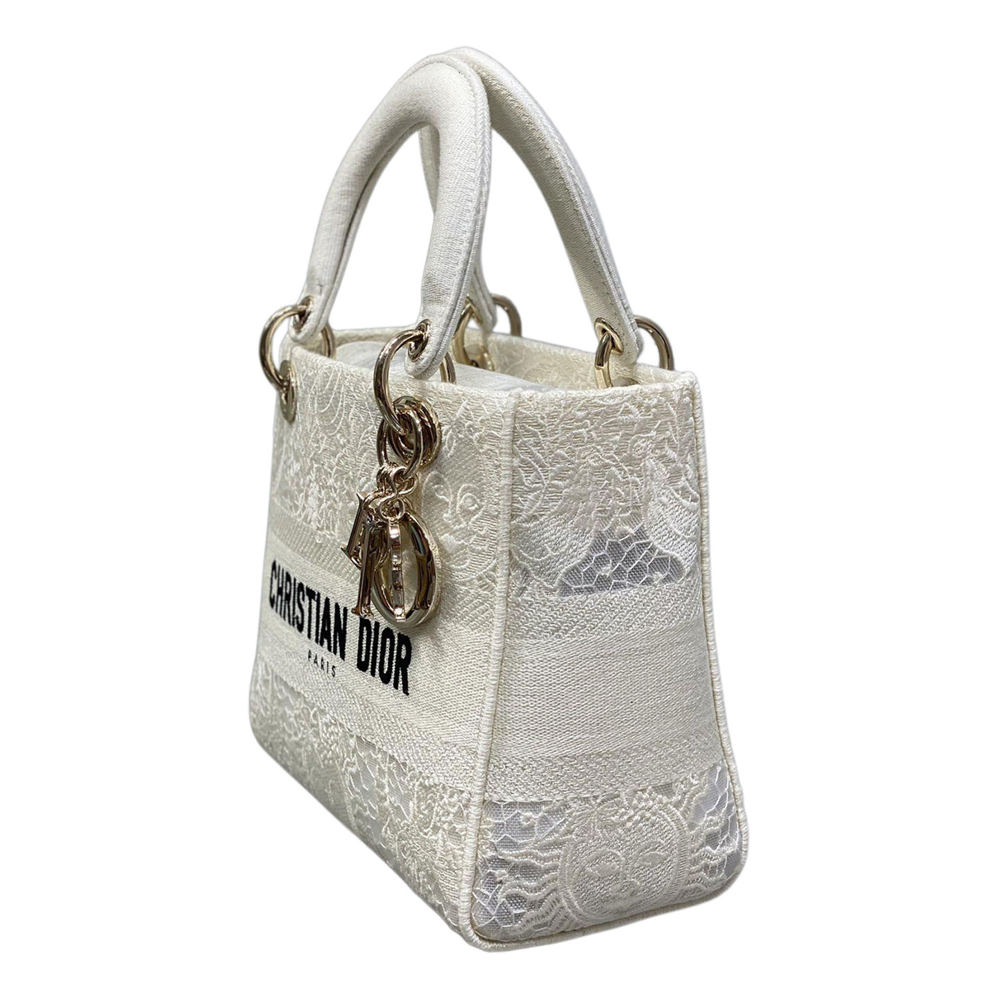 Dior Medium Lady D-Lite In White/Black Lace Embroidered Canvas Gold Hardware
