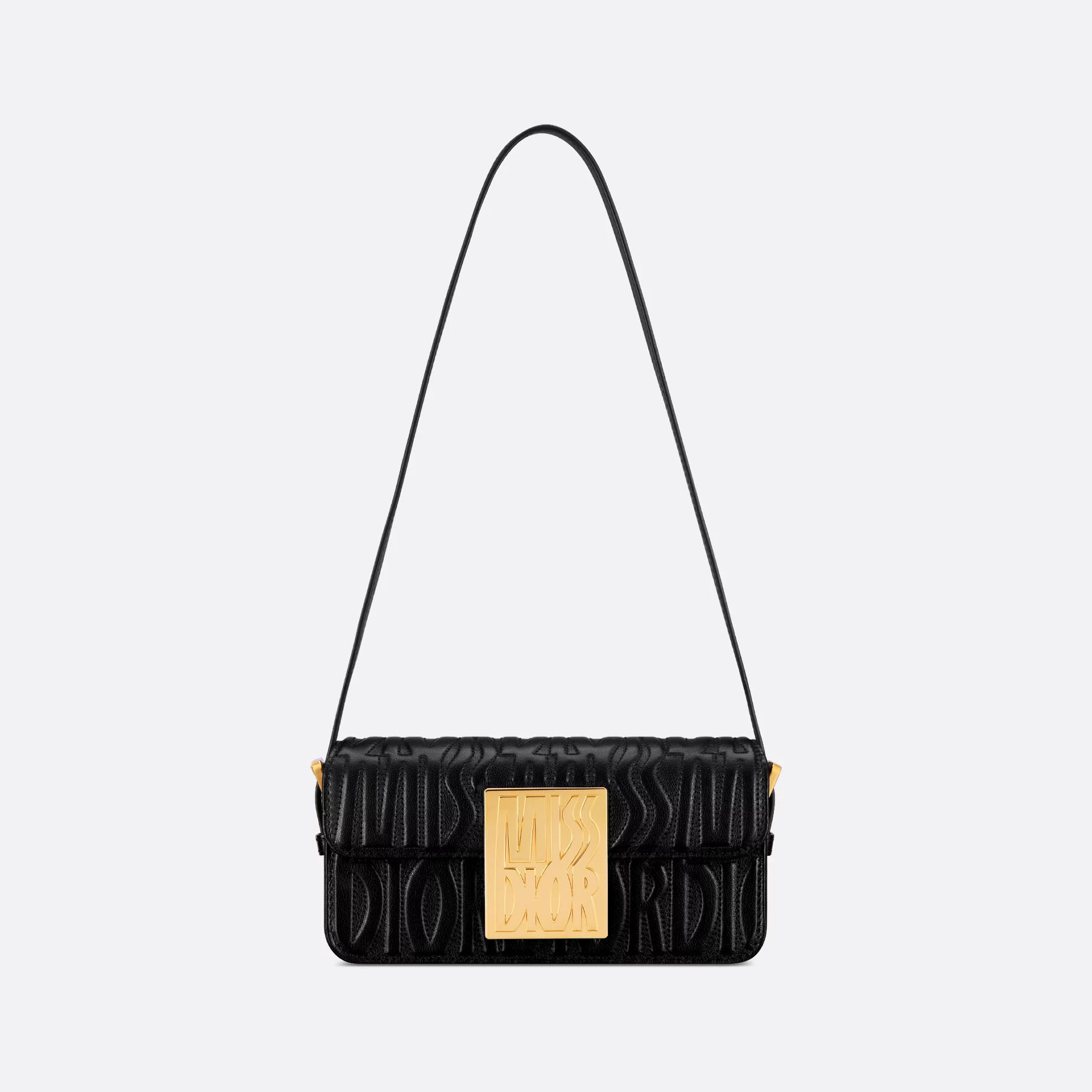 The new Miss Dior flap bag redefines House staples of modern elegance. The black quilted calfskin showcases the collection’s hallmark Miss Dior Allover motif, inspired by the Marc Bohan for Dior archives in a modern take on the 1960s. It has a timeless aesthetic contrasted by a modern plate in antique gold-finish metal with the Miss Dior signature, while the flap reveals a main compartment completed by a zip pocket to accommodate all the essentials. Thanks to the adjustable strap, the bag can be worn over the shoulder for a contemporary and couture style.