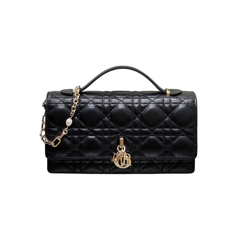 The My Dior mini bag elevates the line with an elegant and functional design. Crafted in lambskin, it features a flap enhanced by D.I.O.R. charms on the front. Equipped with compartments and card slots, the functional accessory will hold all the essentials and is the ideal day and evening companion. A top handle completed by a removable chain punctuated with resin pearls allows the bag to be carried by hand or worn crossbody.