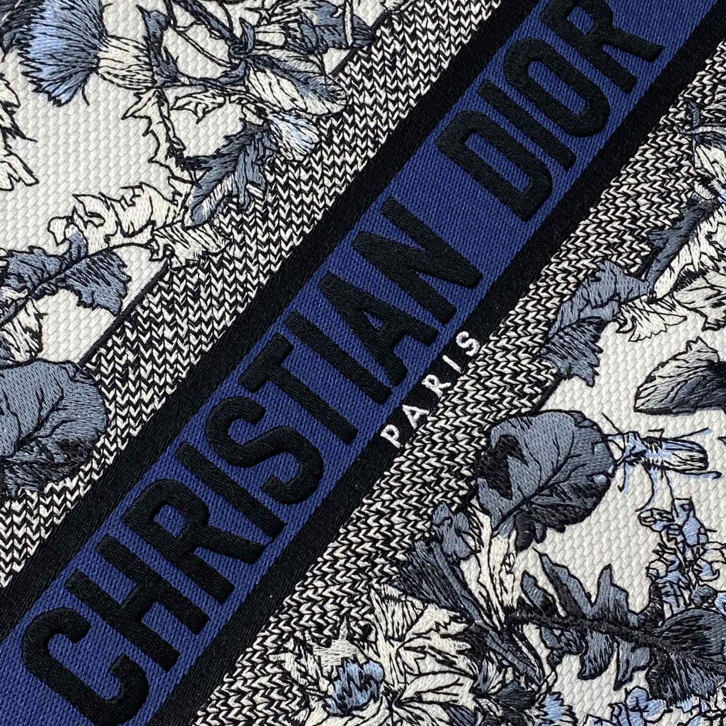 Dior Medium Dior Book Tote In White Embroidery with Denim Blue Dior Chardons Motif