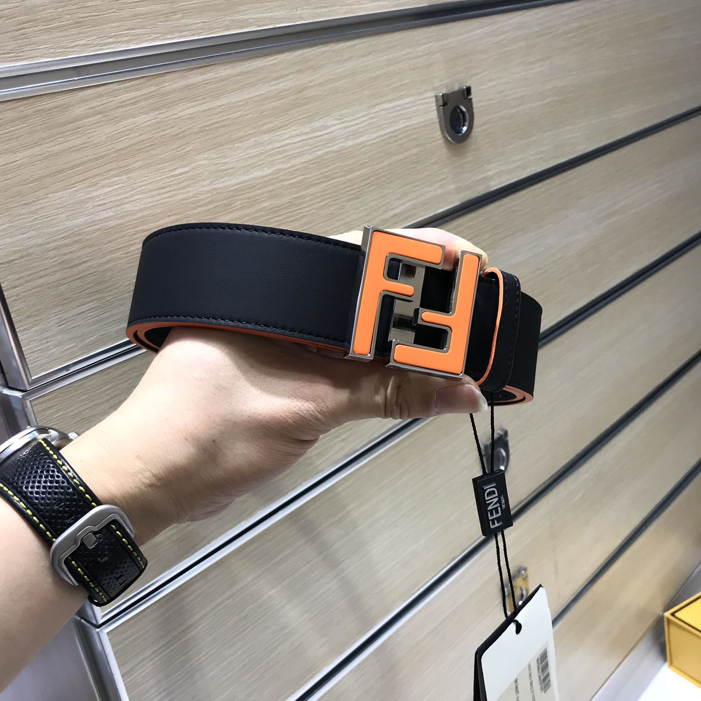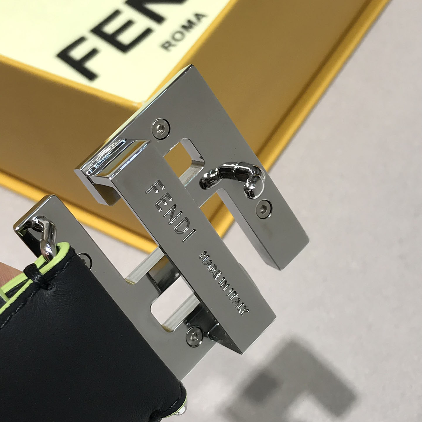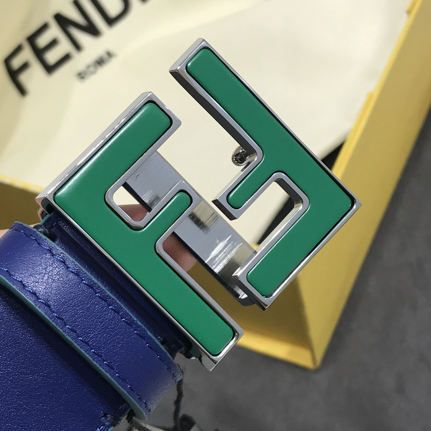 Fendi Men’s Squared FF Buckle Belt In Black/Blue Smooth Calfskin With Silver Hardware 40mm