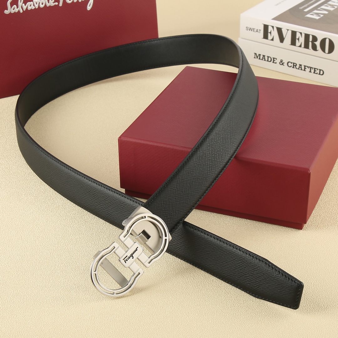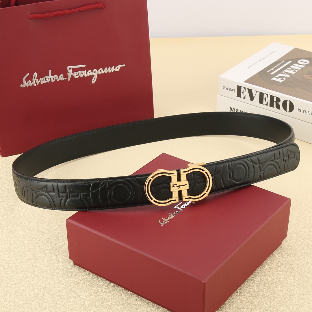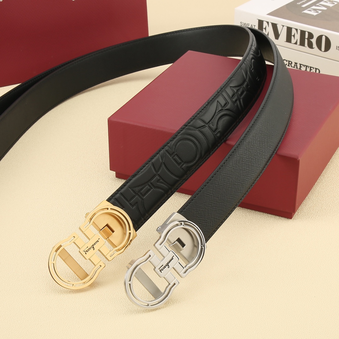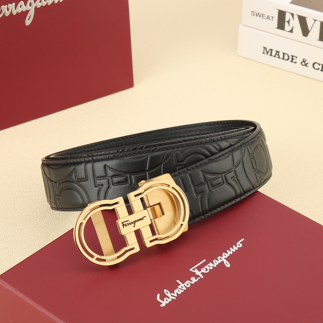 Ferragamo Men’s Hollow Double Gancini Buckle Belt In Black Calfskin With Gold/Silver Hardware 35mm