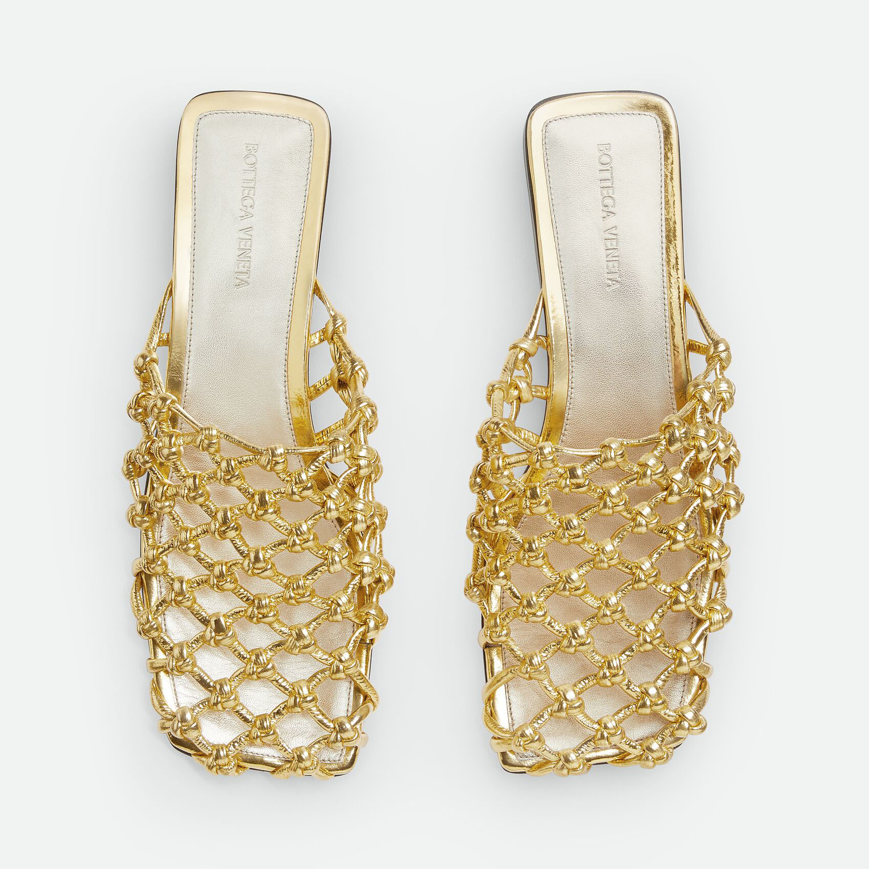 • Bottega Veneta Riva Flat Mule In Gold Woven Hand-Knotted Leather Mule Pump