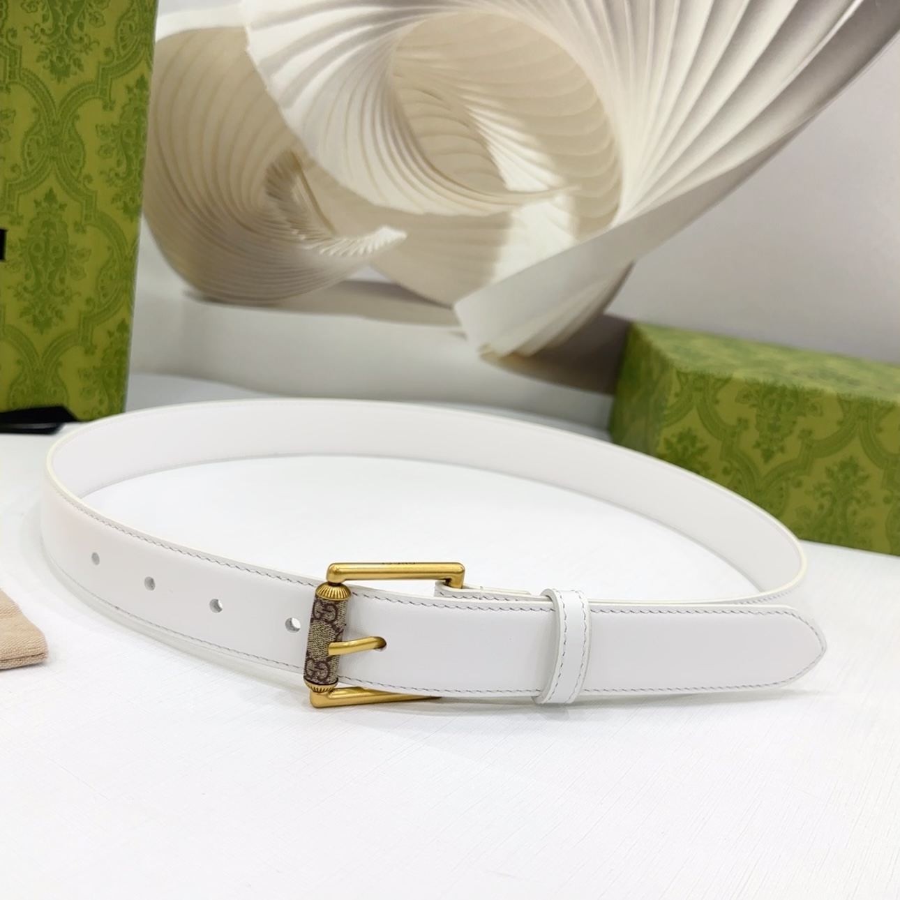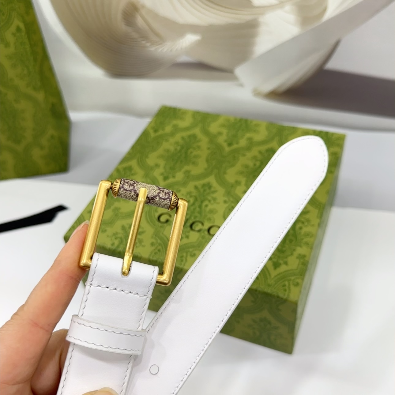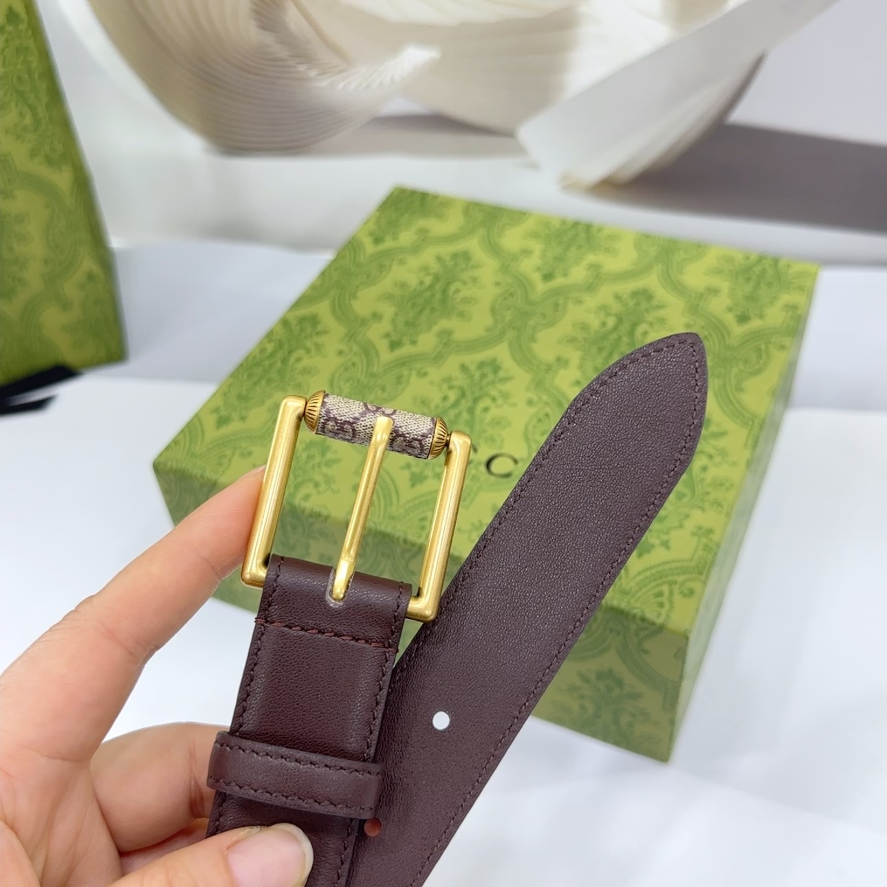 Gucci Women’s Emblem Belt With Monogram Buckle In Brown/White/Black Smooth Calfskin With Gold Hardware 30mm