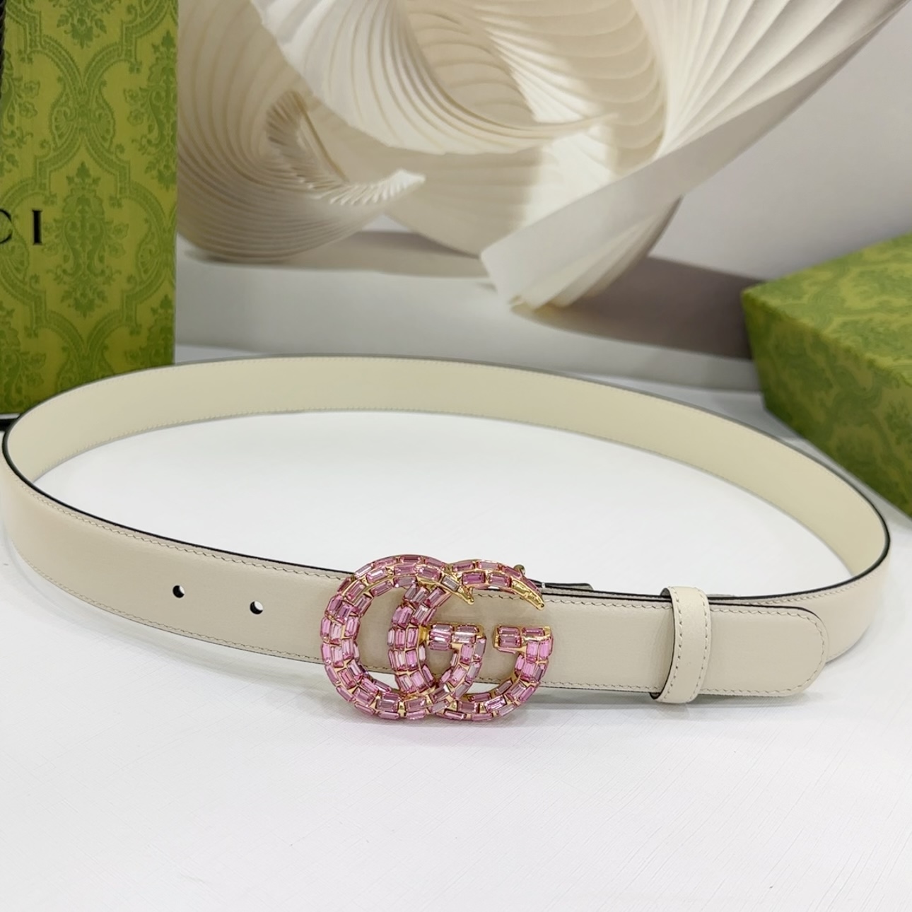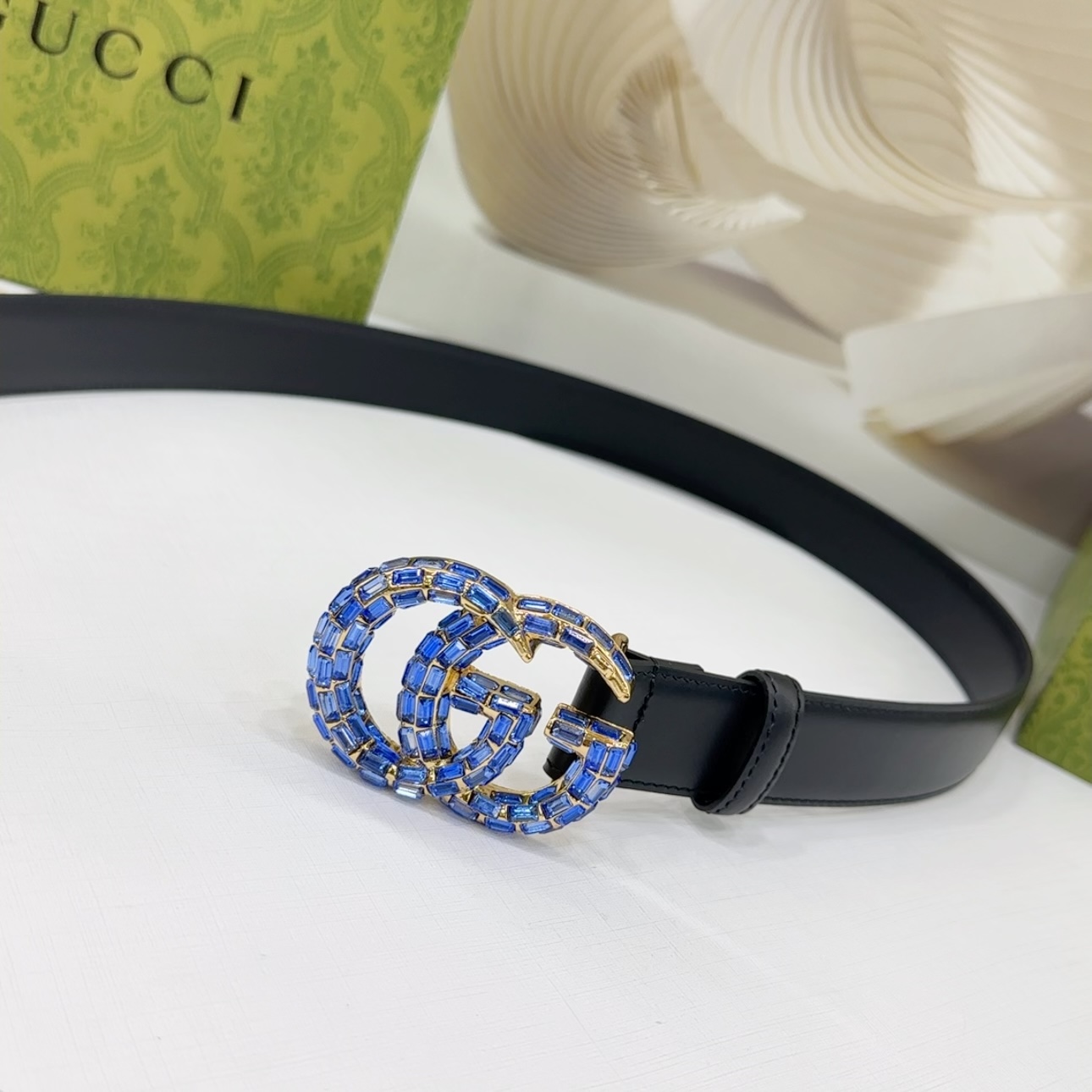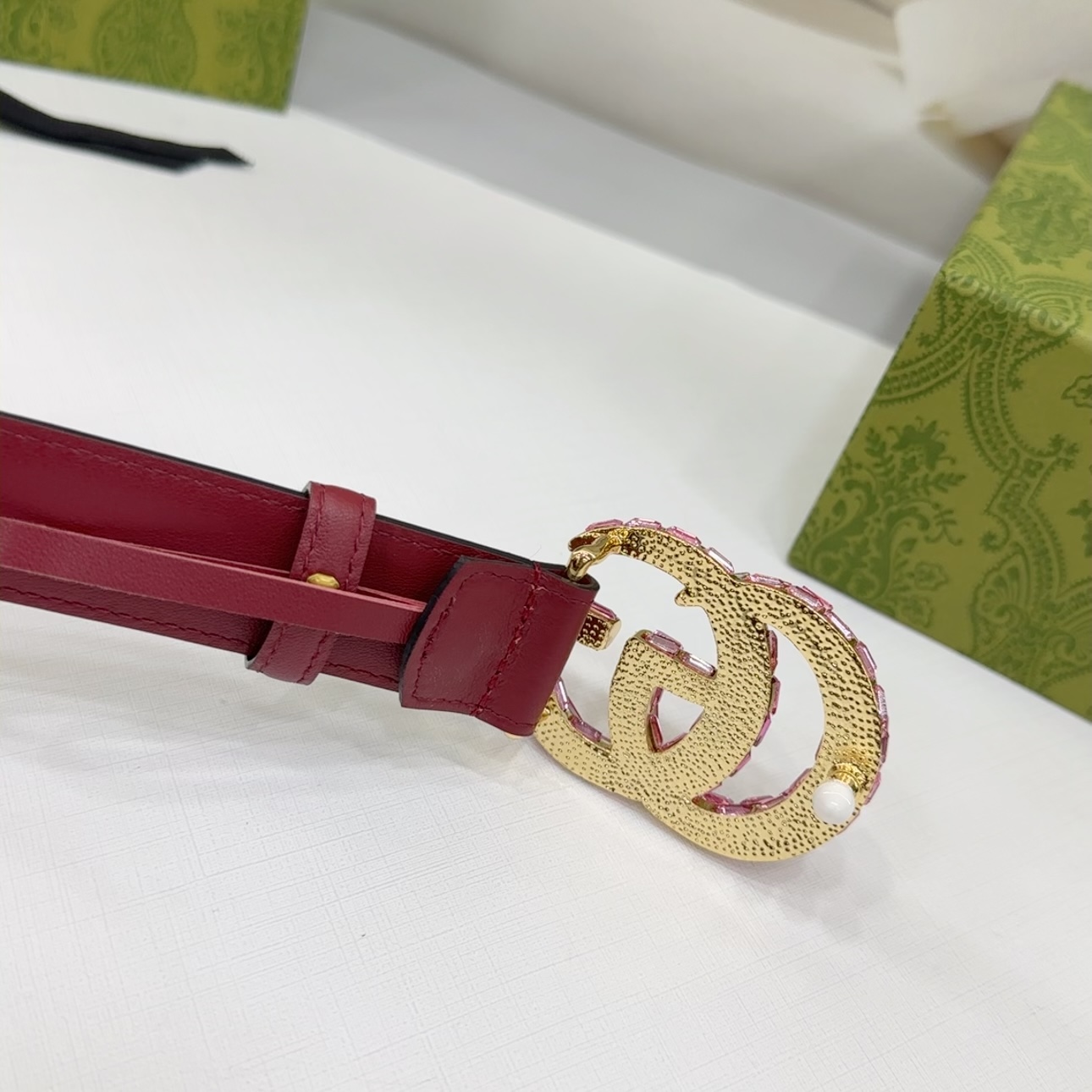 Gucci Women’s GG Buckle With Crystals Marmont Thin Belt In Black/Red/Khaki/White/Grey/Green Smooth Calfskin With Gold/Silver Hardware 30mm