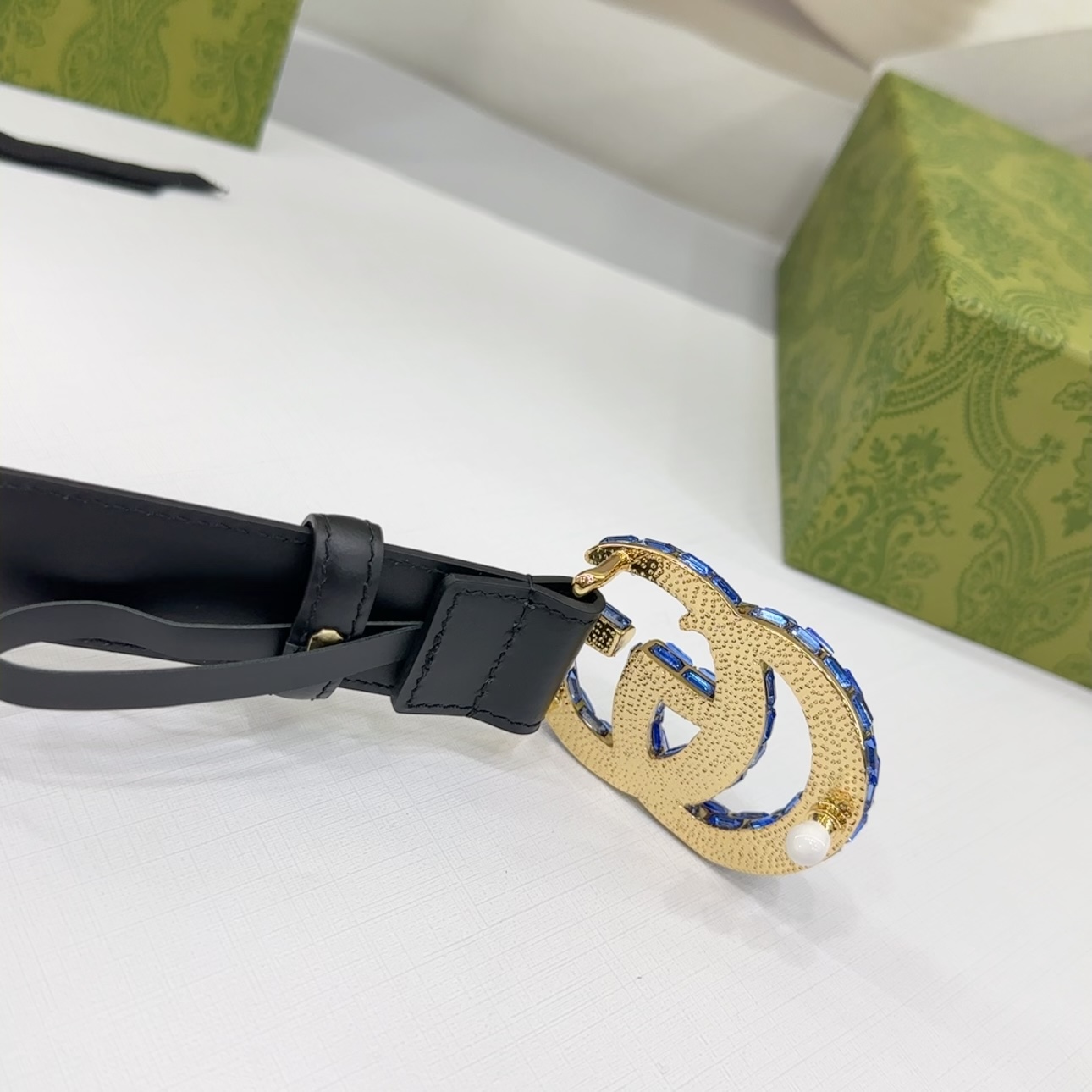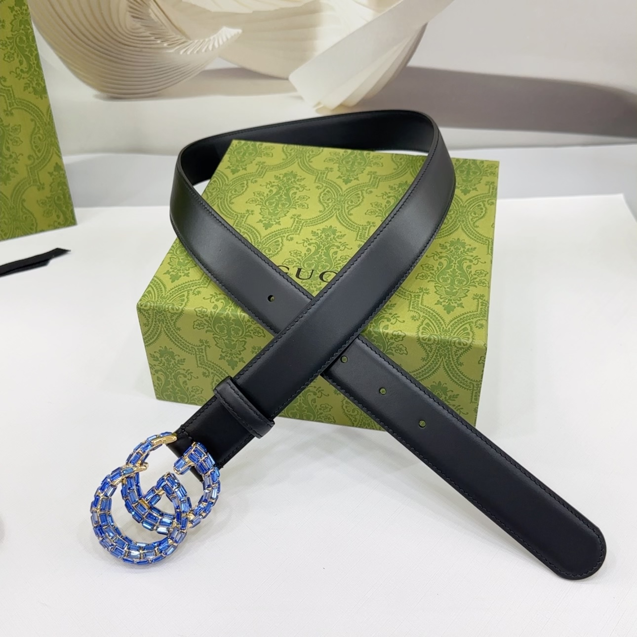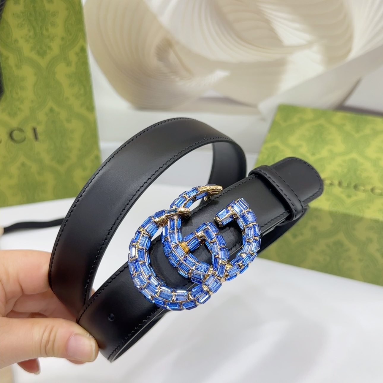 Gucci Women’s GG Buckle With Crystals Marmont Thin Belt In Black/Red/Khaki/White/Grey/Green Smooth Calfskin With Gold/Silver Hardware 30mm