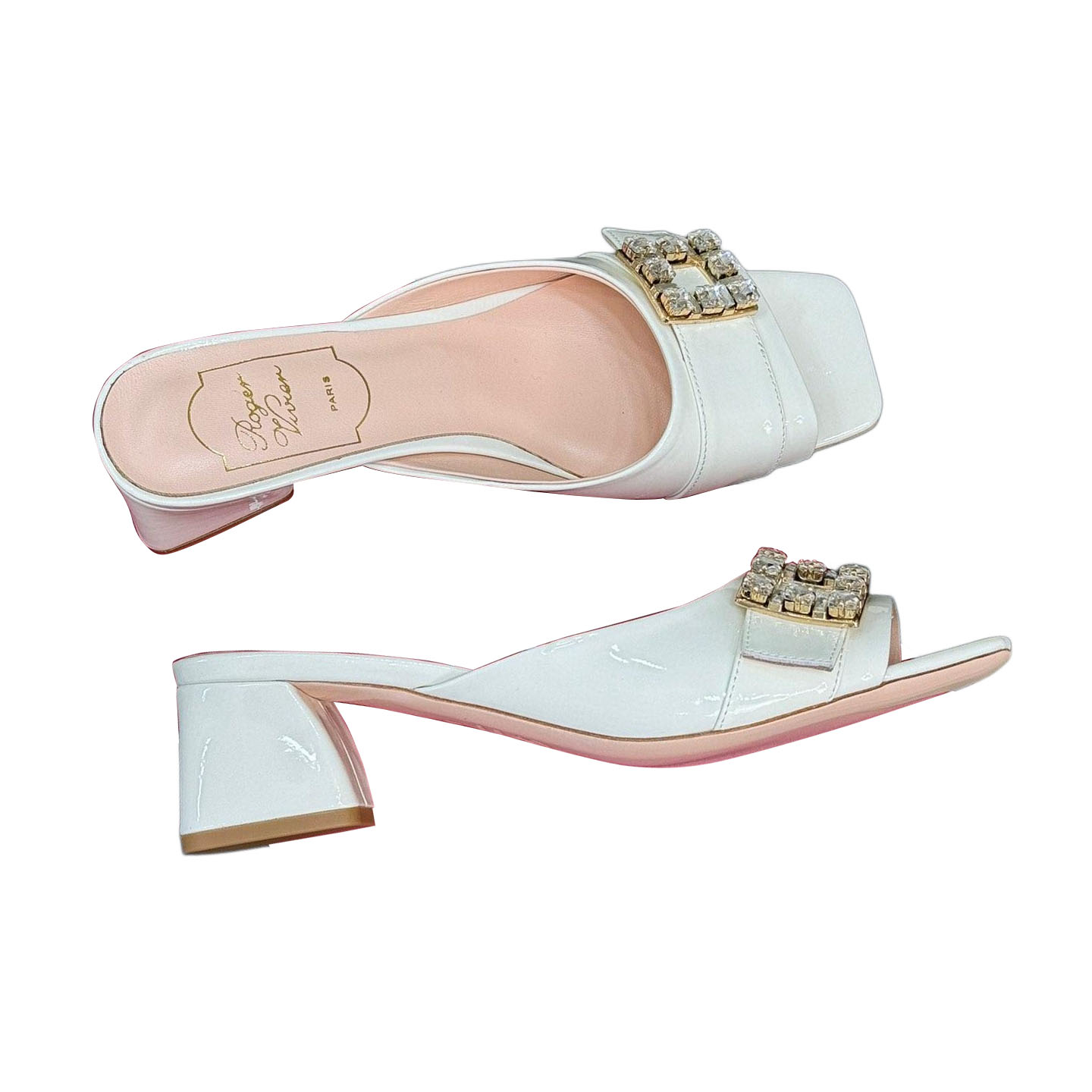 Roger Vivier Tr猫s Vivier Mules High Heels In White/Black Patent Leather With Crystal Buckle (Heel Height 3.5cm)