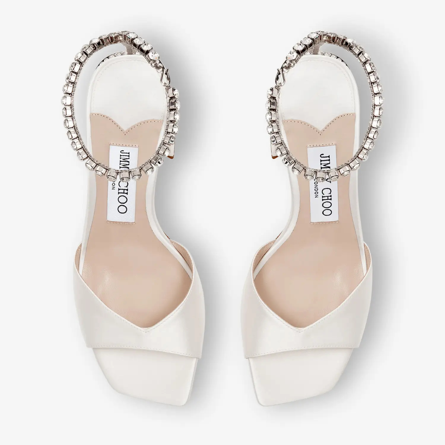 JIMMY CHOO Crystal chain ivory white satin sandals with wide high heels