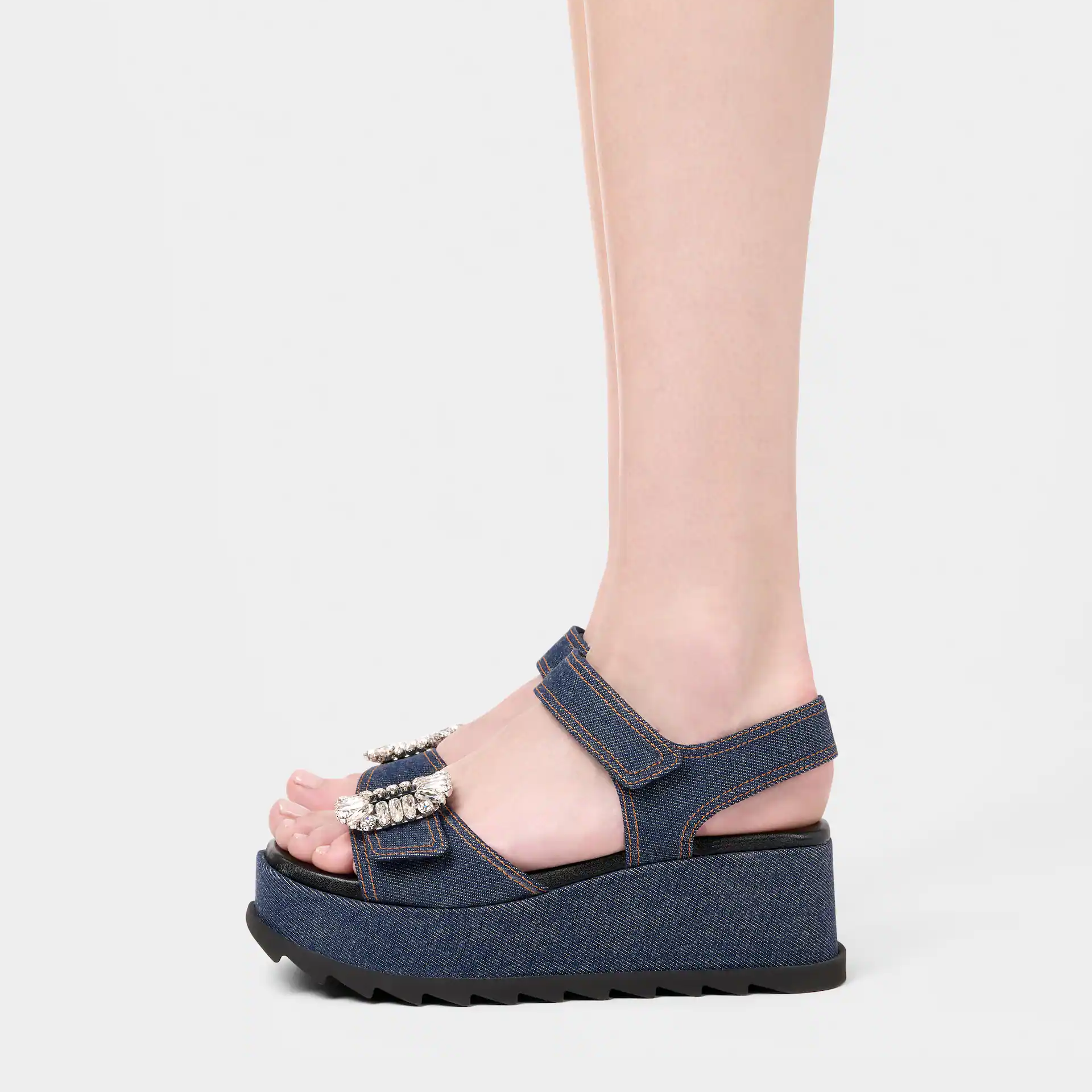 • Roger Vivier Slidy Viv�� Wedge Sandals In Blue Denim With Crystal Buckle (Heel Height 6.5cm)
