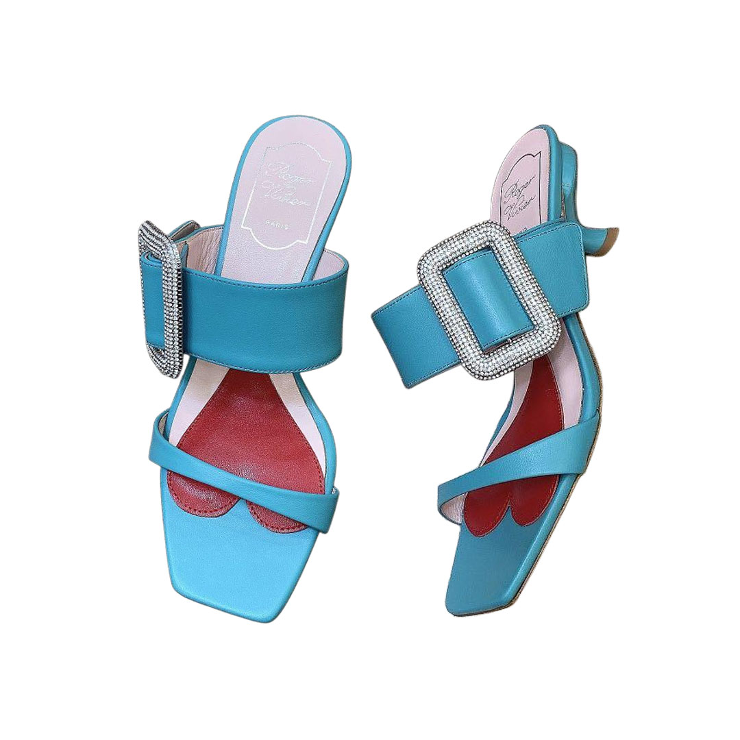 Roger Vivier Viv�� Rangers Mules Sandals In White/Black/Blue Leather With Crystal Buckle (Heel Height 5.5cm)