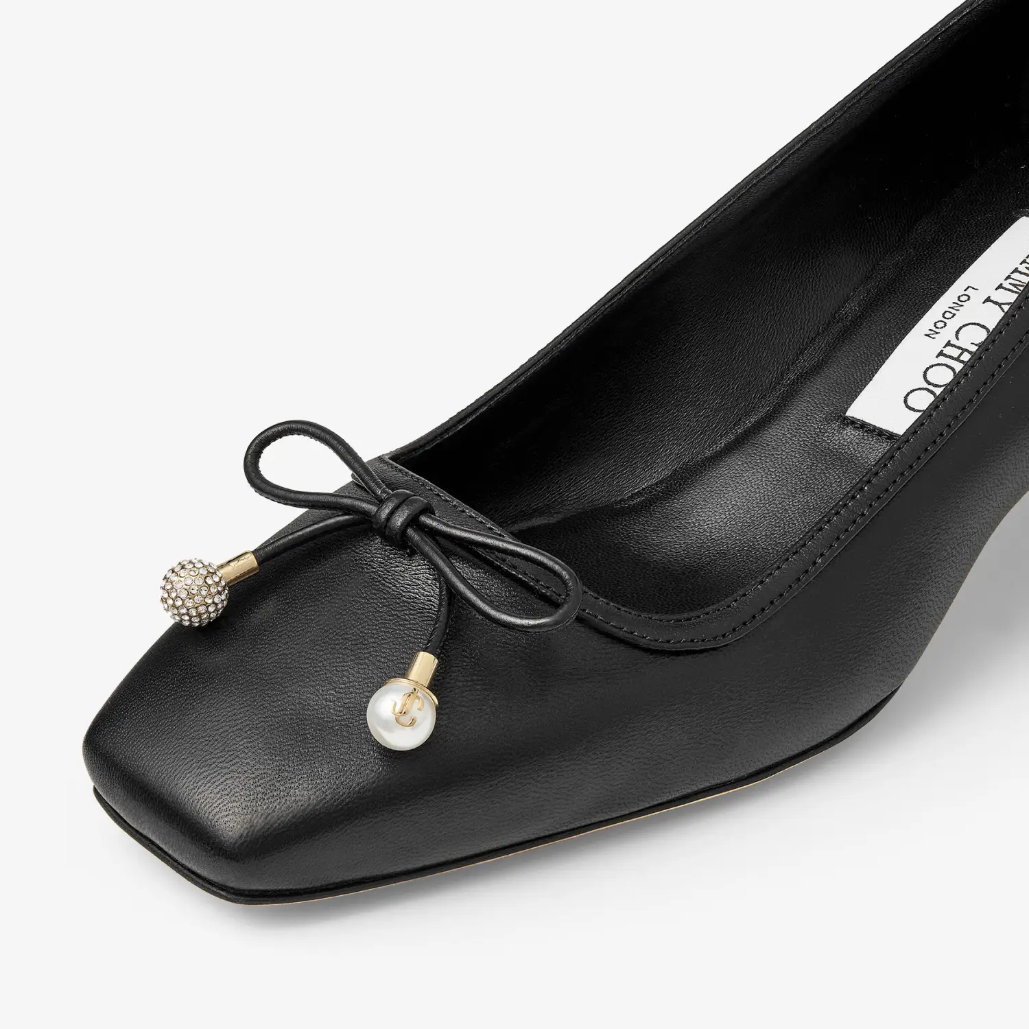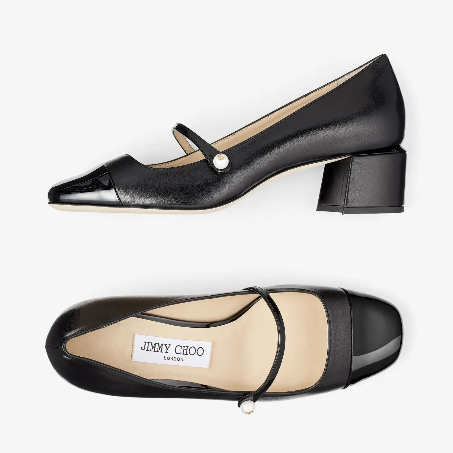 JIMMY CHOO Black leather and Patent paint leather heels Square head and thick heel shoes