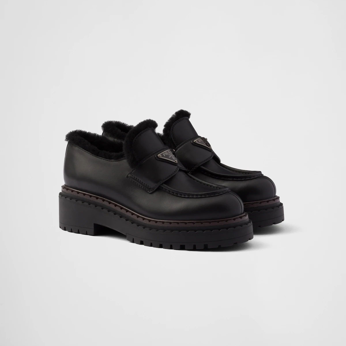 PRADA Black double fabric Chocolate leather and sheep fur loafers