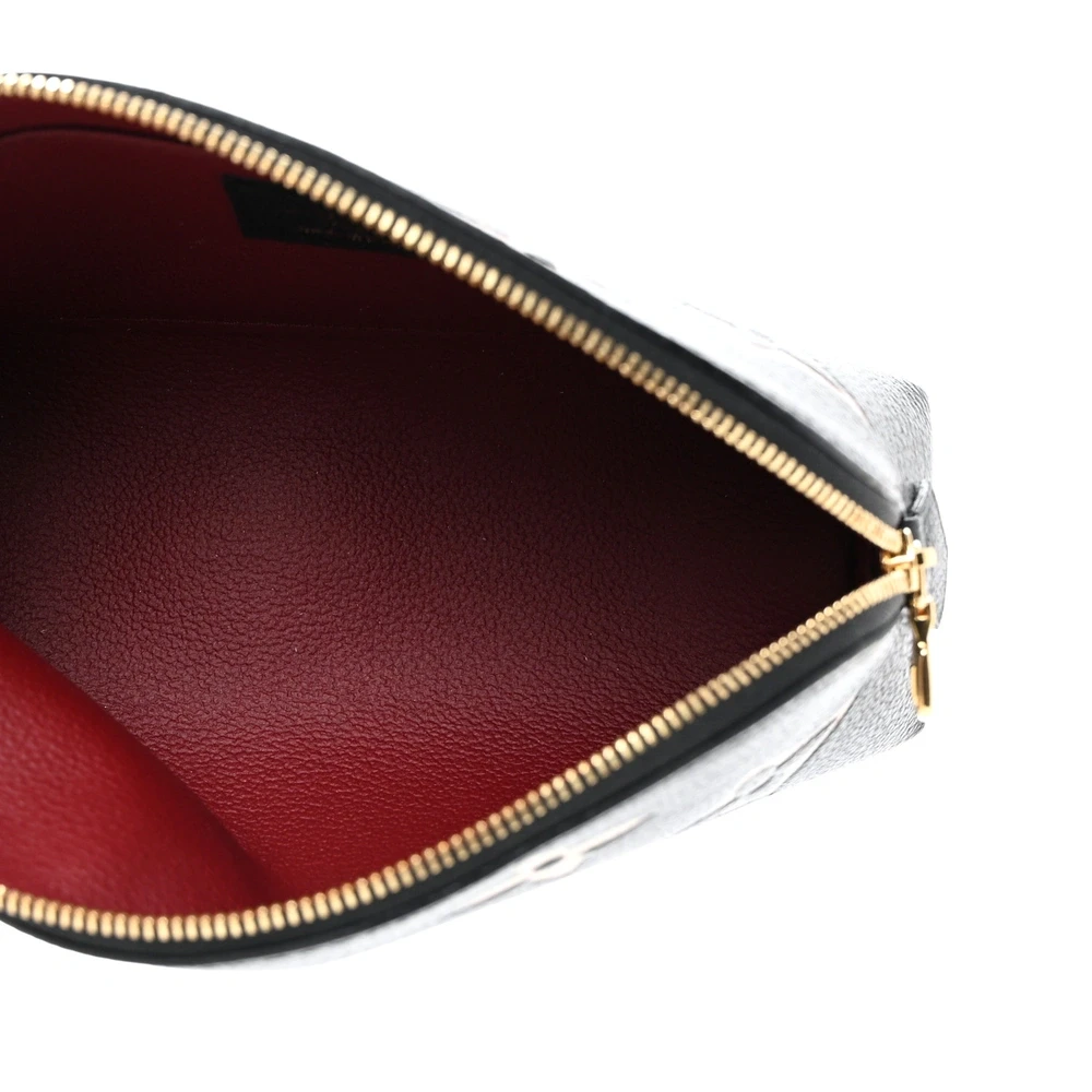 This Louis Vuitton Empreinte Monogram Giant Cosmetic Pouch in black and beige is a stylish and practical accessory. Crafted from monogram-embossed leather, this pouch features a gold wrap-around zipper and a red microfiber interior with a patch pocket for easy organization. It combines elegant style with everyday functionality.