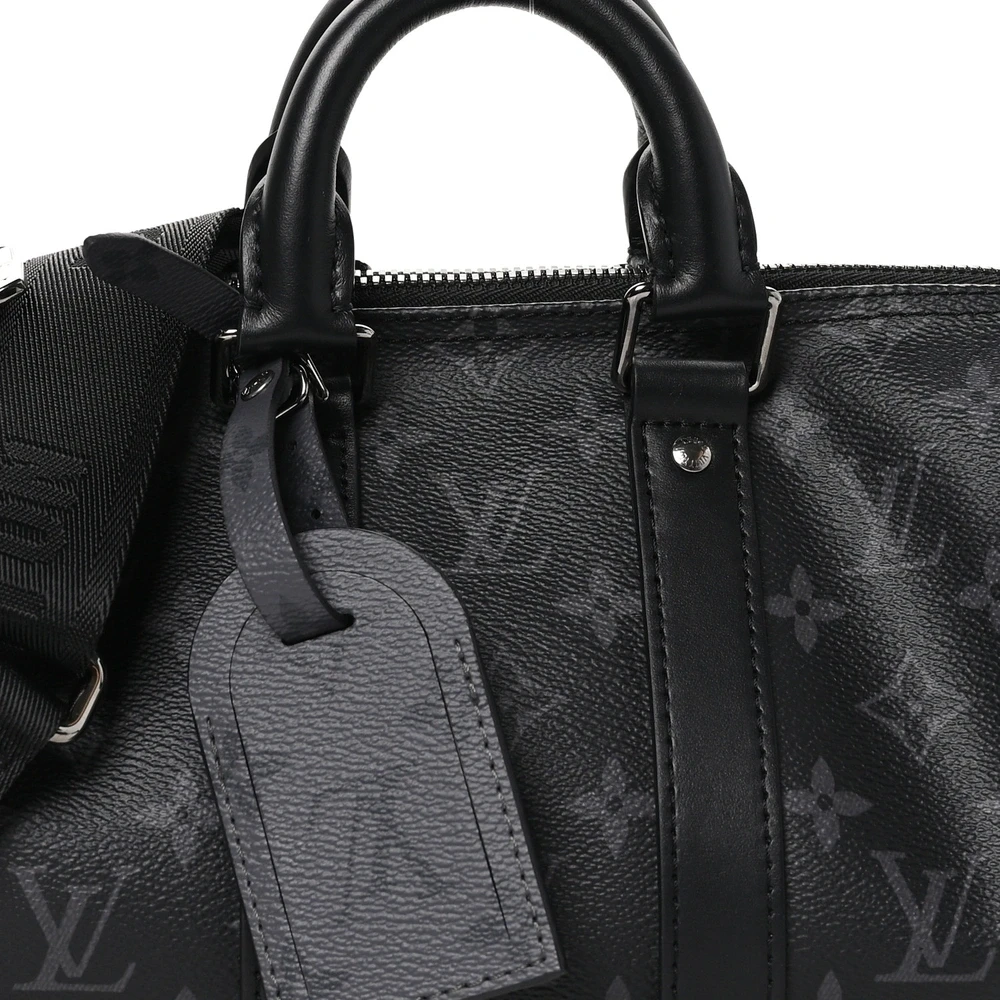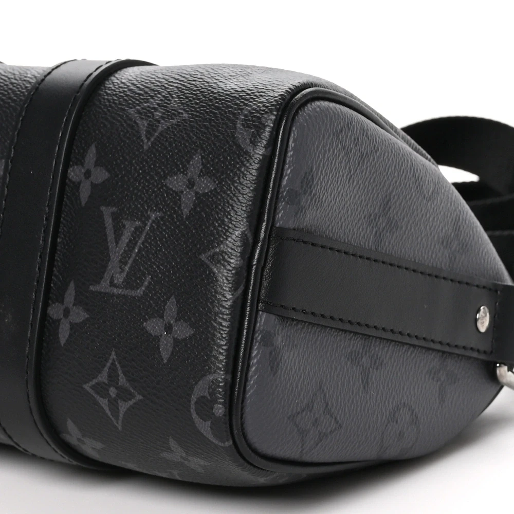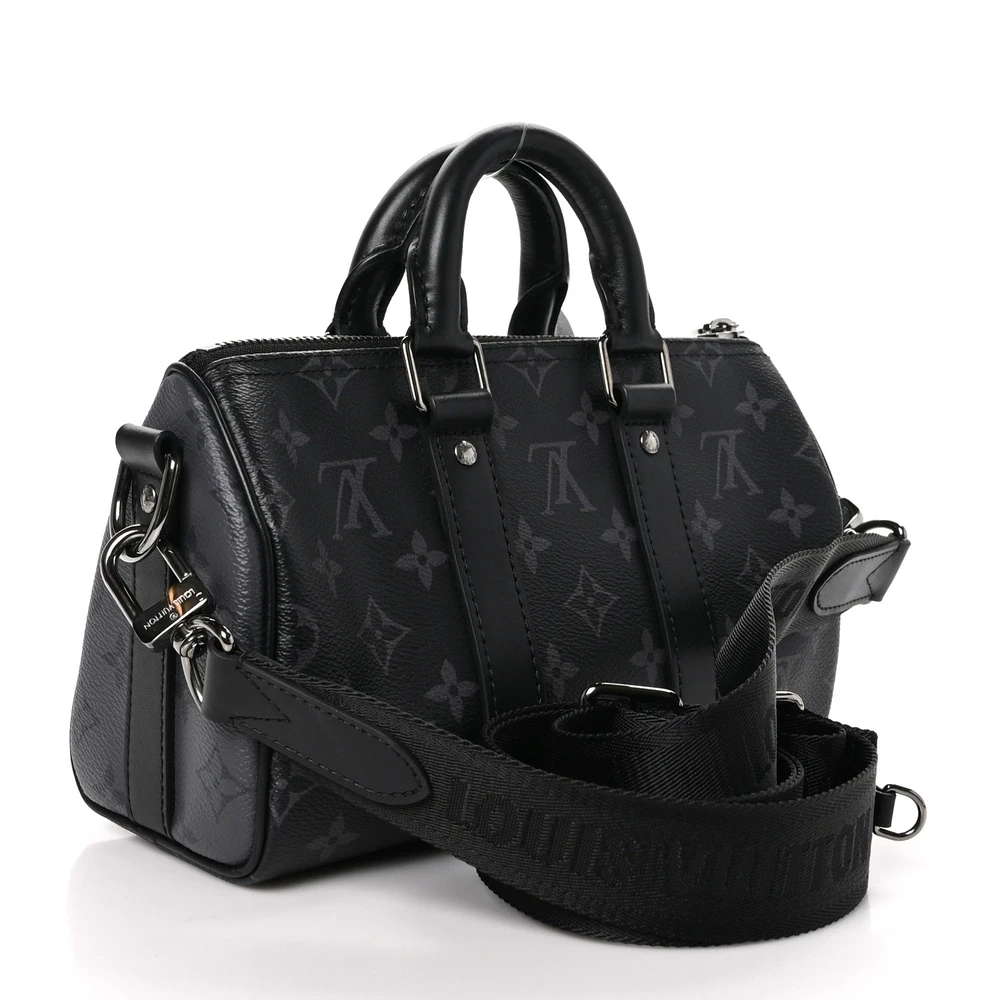 This Louis Vuitton Reverse Monogram Eclipse Canvas Keepall Bandouliere 25 is a modern, sleek version of the classic Keepall. Crafted from reverse monogram eclipse canvas, it features silver hardware and an adjustable shoulder strap, making it perfect for travel or everyday use with a stylish edge.