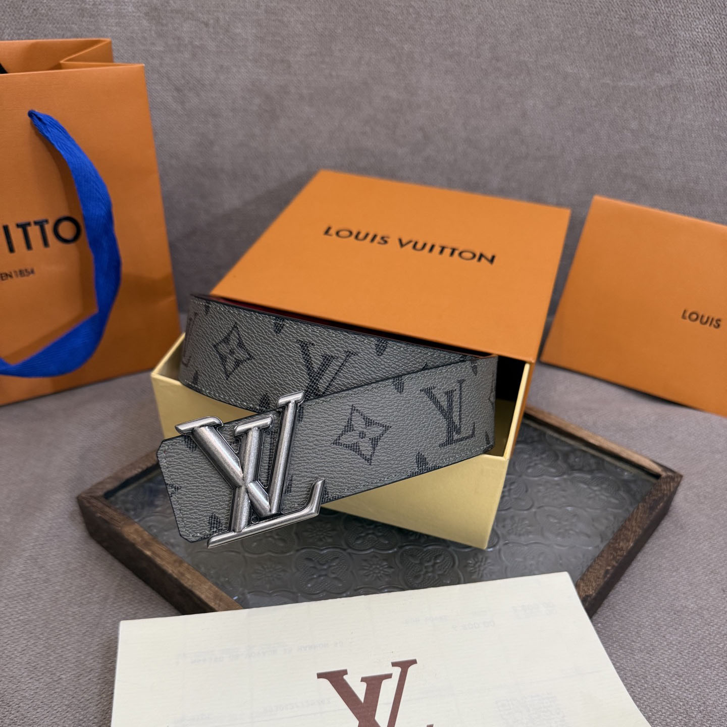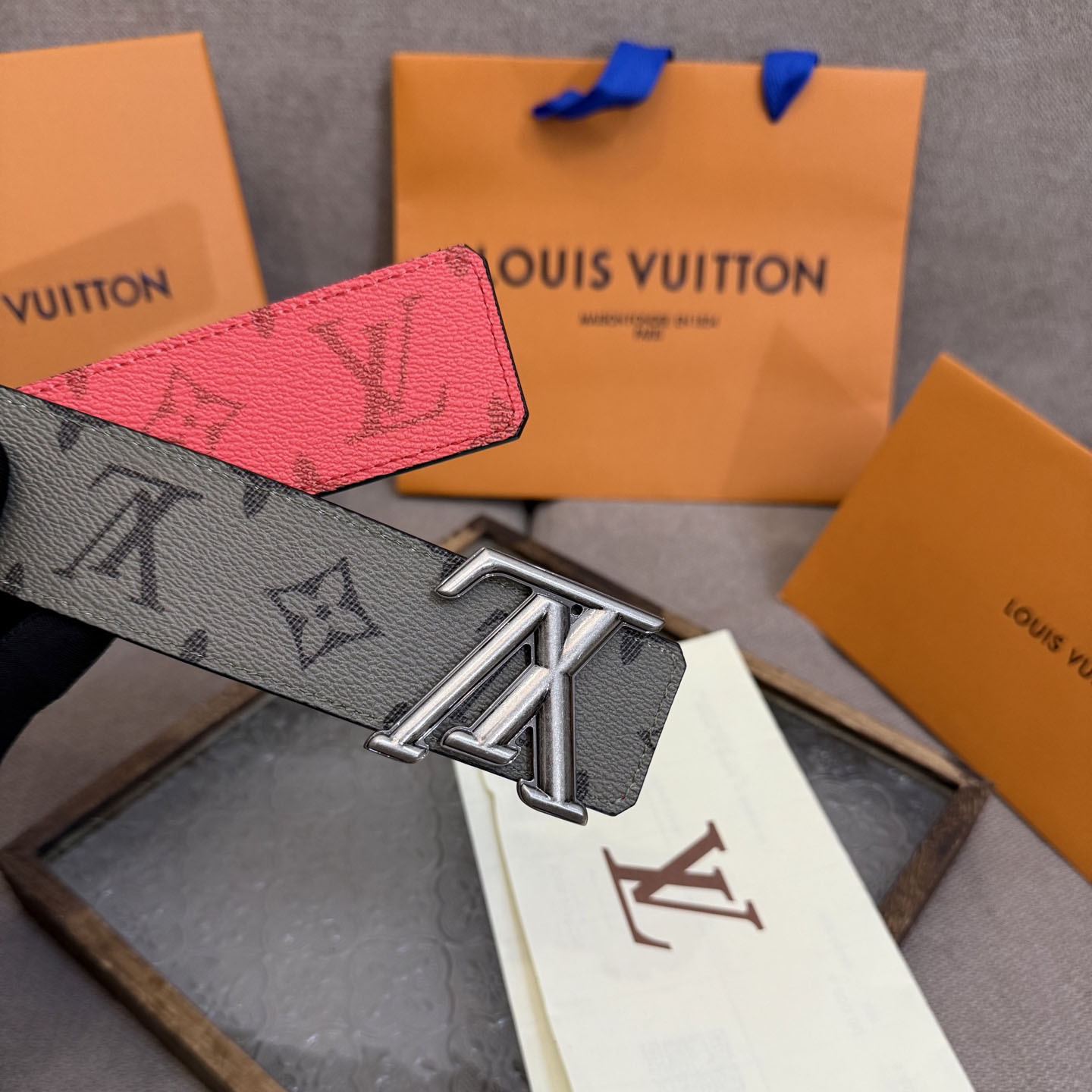 Louis Vuitton Men’s Line Reversible Belt In Grey/Pink/Black/Blue/White/Green Monogram Canvas With Gold/Silver Hardware 40mm