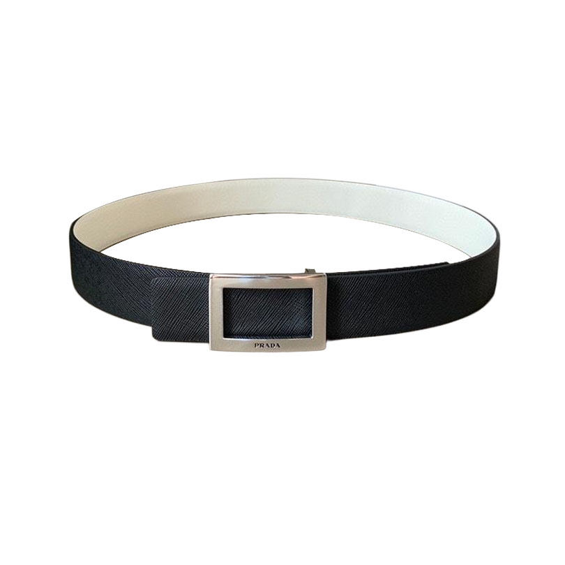 Prada Men’ s Square Buckle Reversible Belt In Black/Blue/White Saffiano Calfskin With Gold/Silver Hardware 34mm