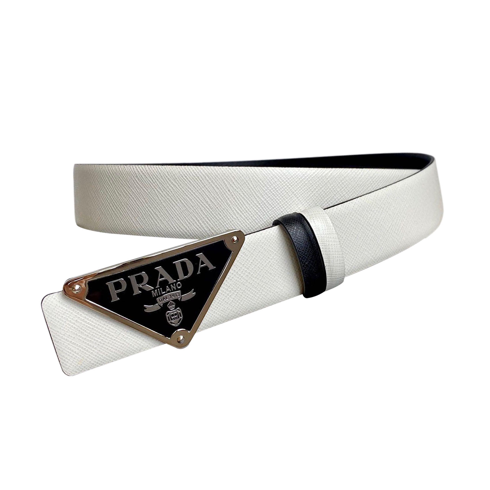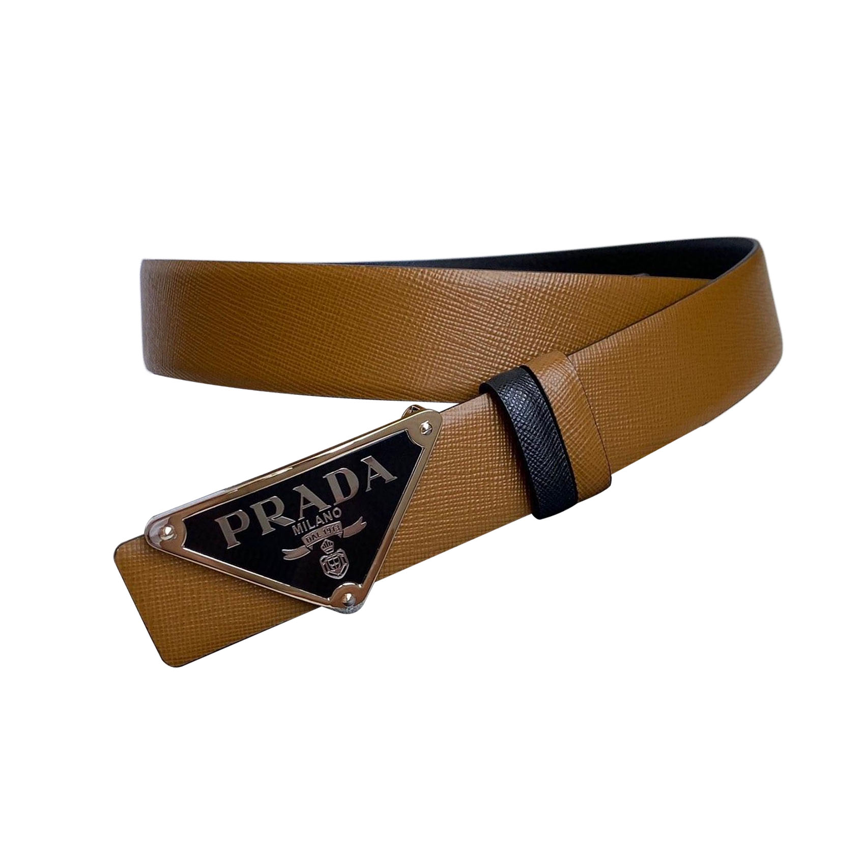 Prada Men’ s Triangled Buckle Belt In Black/Brown/White/Blue Saffiano Calfskin With Gold/Silver Hardware 35mm