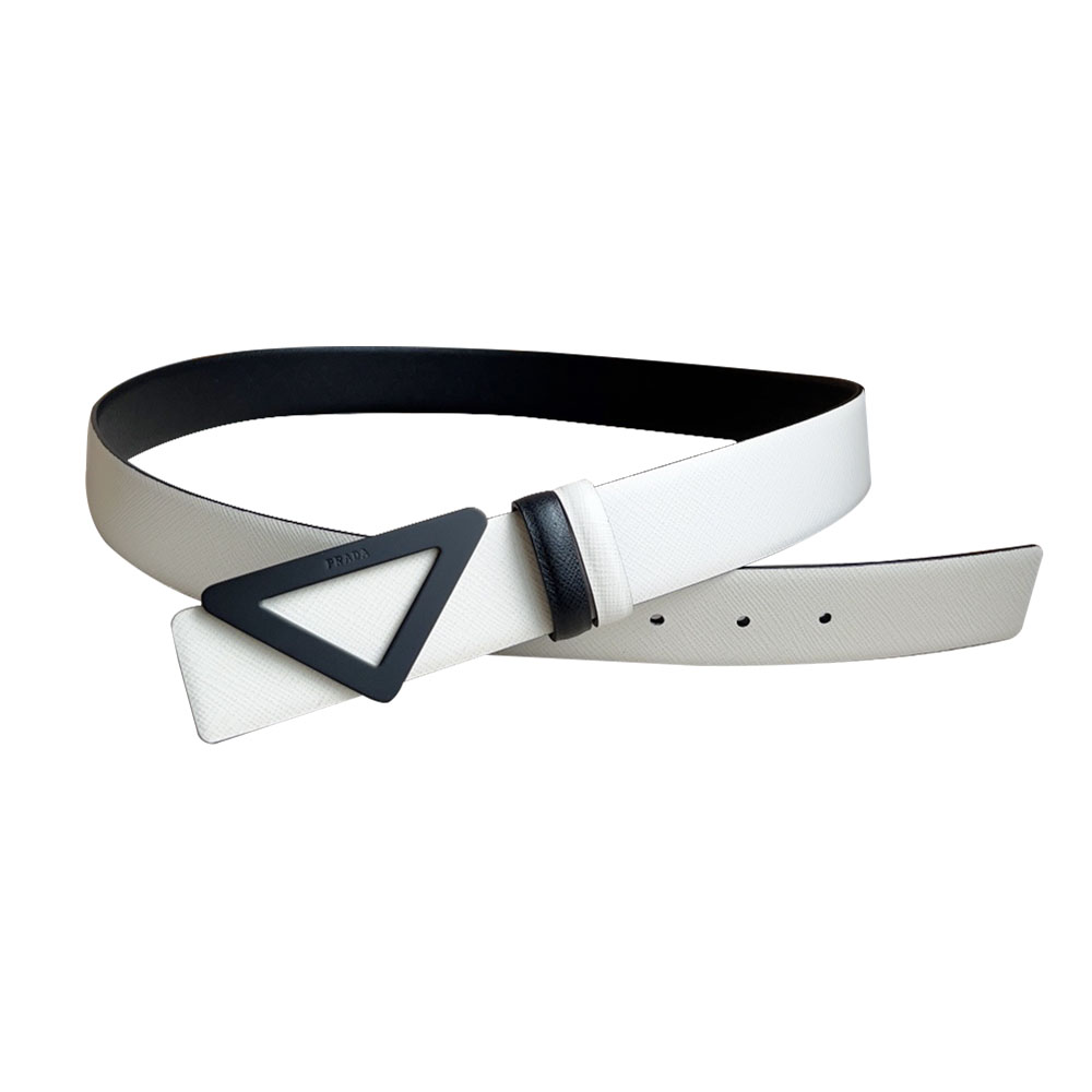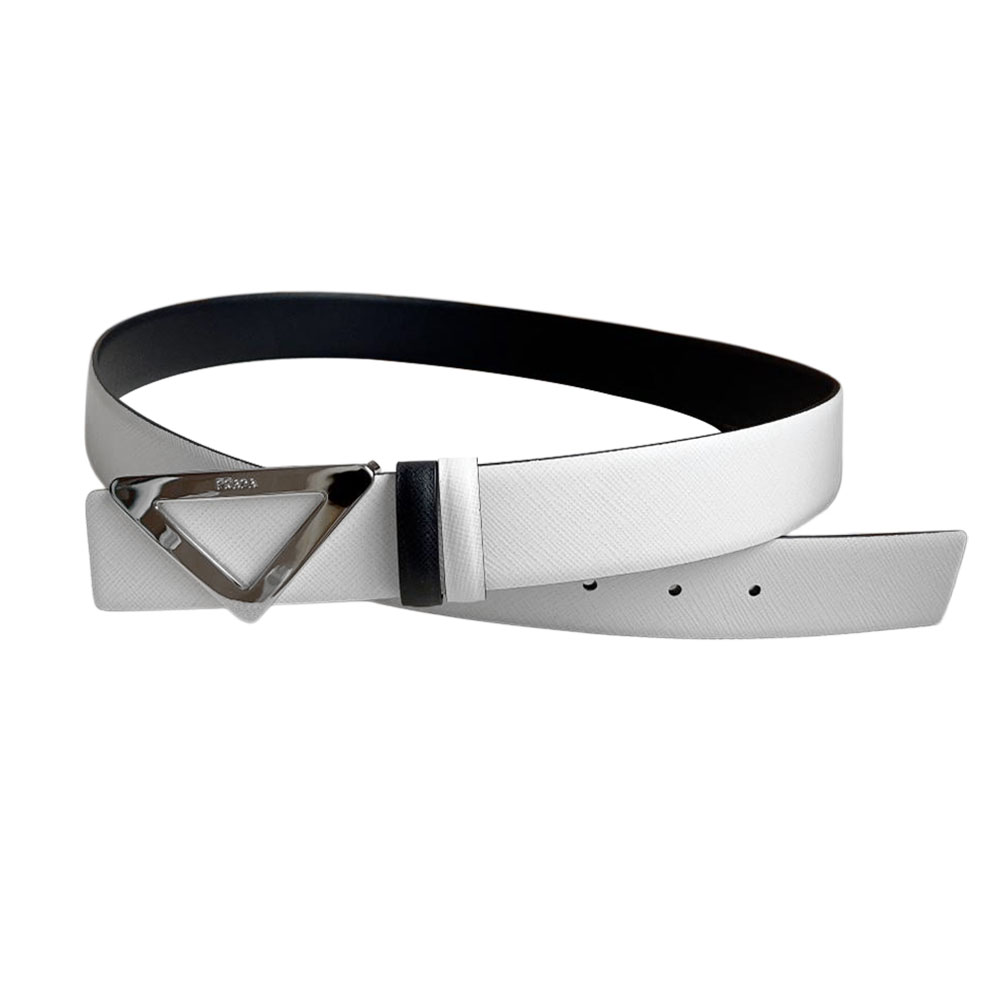 Prada Men’ s Triangled Buckle Belt In Black/White/Brown/Blue Saffiano Calfskin With Gold/Silver/Black Hardware 35mm