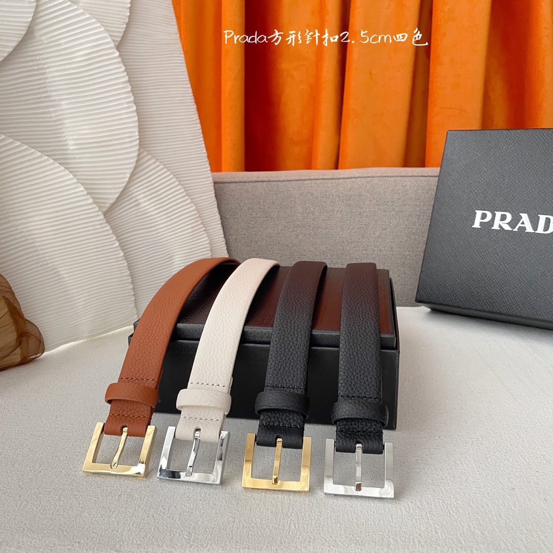 • Prada Women’ s Square Buckle Belt In Brown/White/Black Calfskin With Gold/Silver Hardware 25mm