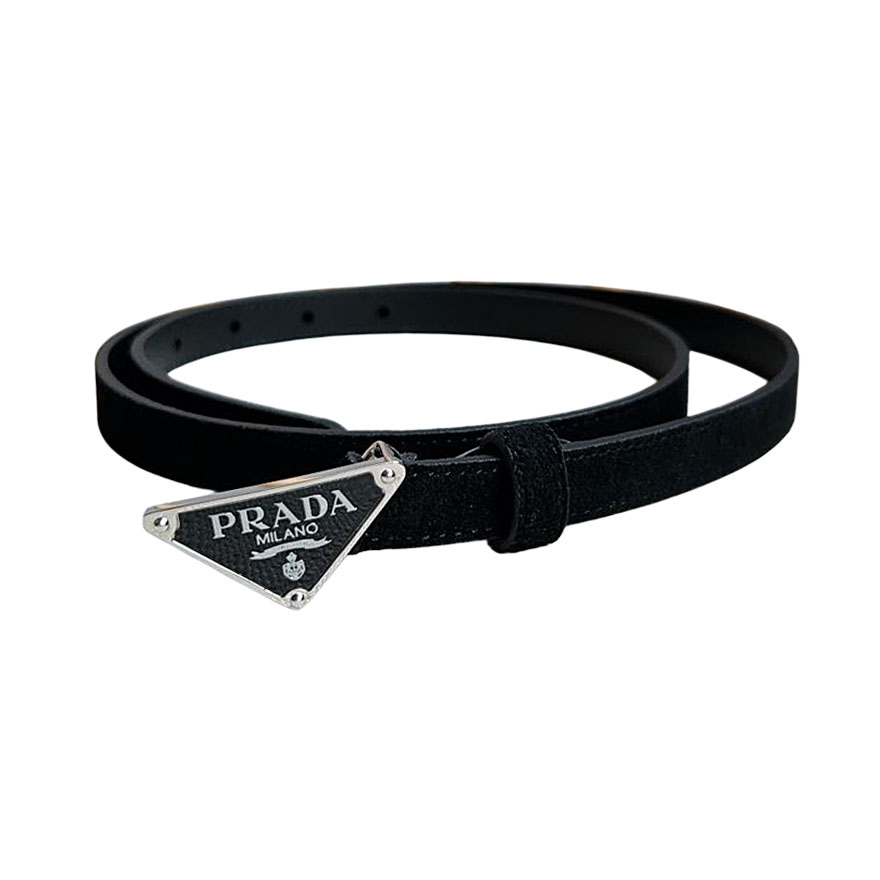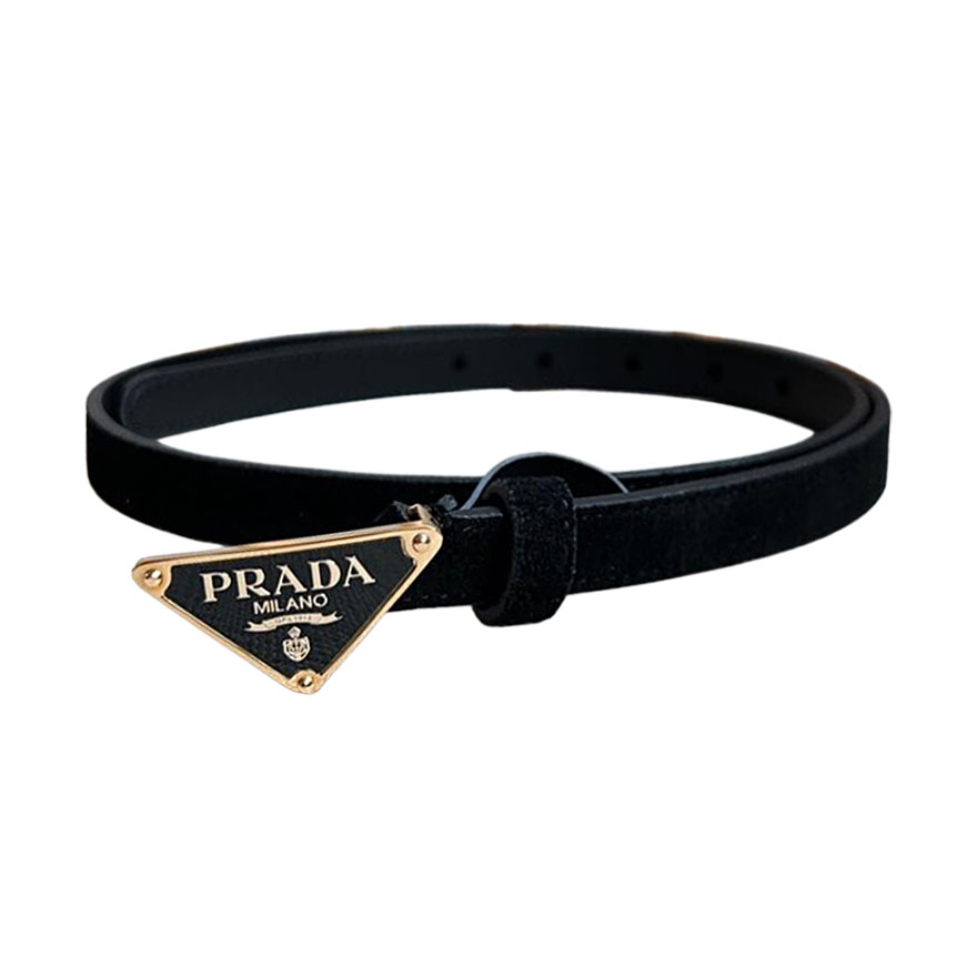 Prada Women’ s Triangled Buckle Belt In Brown/Black Calfskin With Gold/Silver Hardware 15mm