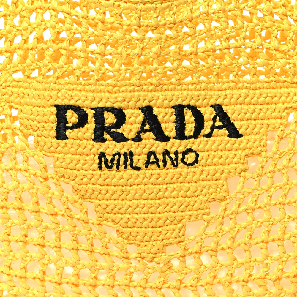 Prada Large Effect Crochet Logo Embroidered Tote Bag Giallo Yarn Raffia