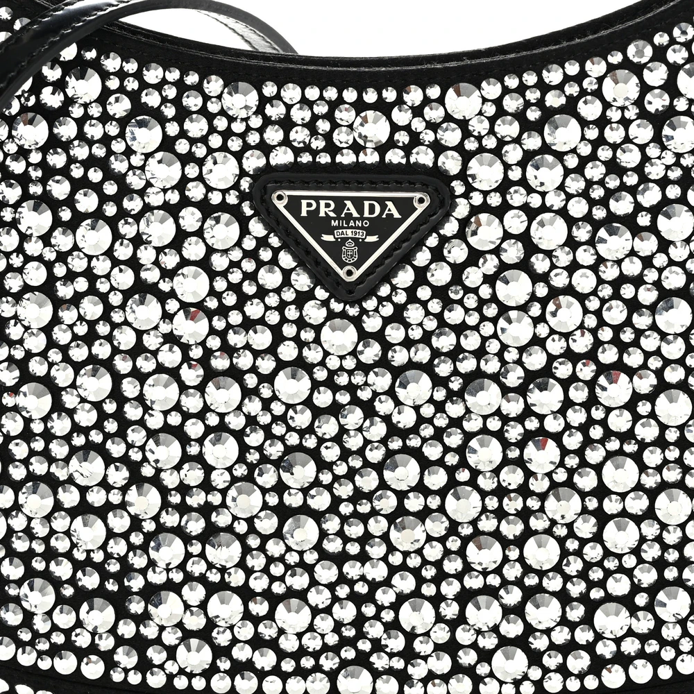 Prada Medium Cleo Adjustable Strap Shoulder Bag Metal Satin & Crystal Silver Hardware