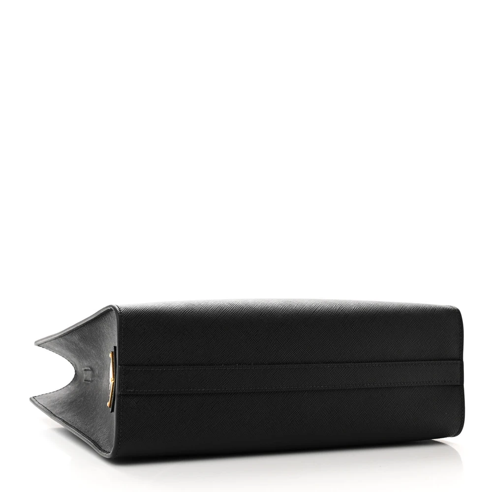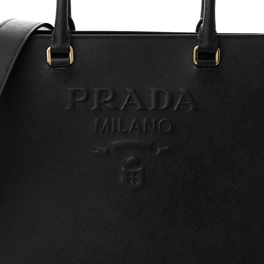Prada Medium Lux Logo Embossed Shoulder Tote Handbag Black Saffiano Leather