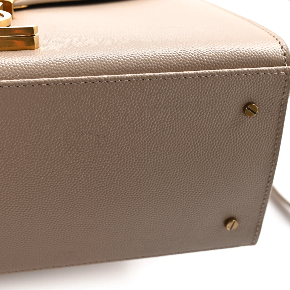 This Medium Cassandra Top Handle in Dark Beige showcases Classic Monogram Grain De Poudre Leather with aged gold hardware. The structured silhouette is perfect for sophisticated occasions, offering a spacious interior and a secure magnetic closure. Its top handle and detachable strap provide versatile carrying options. The timeless design is completed with the iconic YSL logo and an elegant finish. A refined choice for elevating any outfit.
