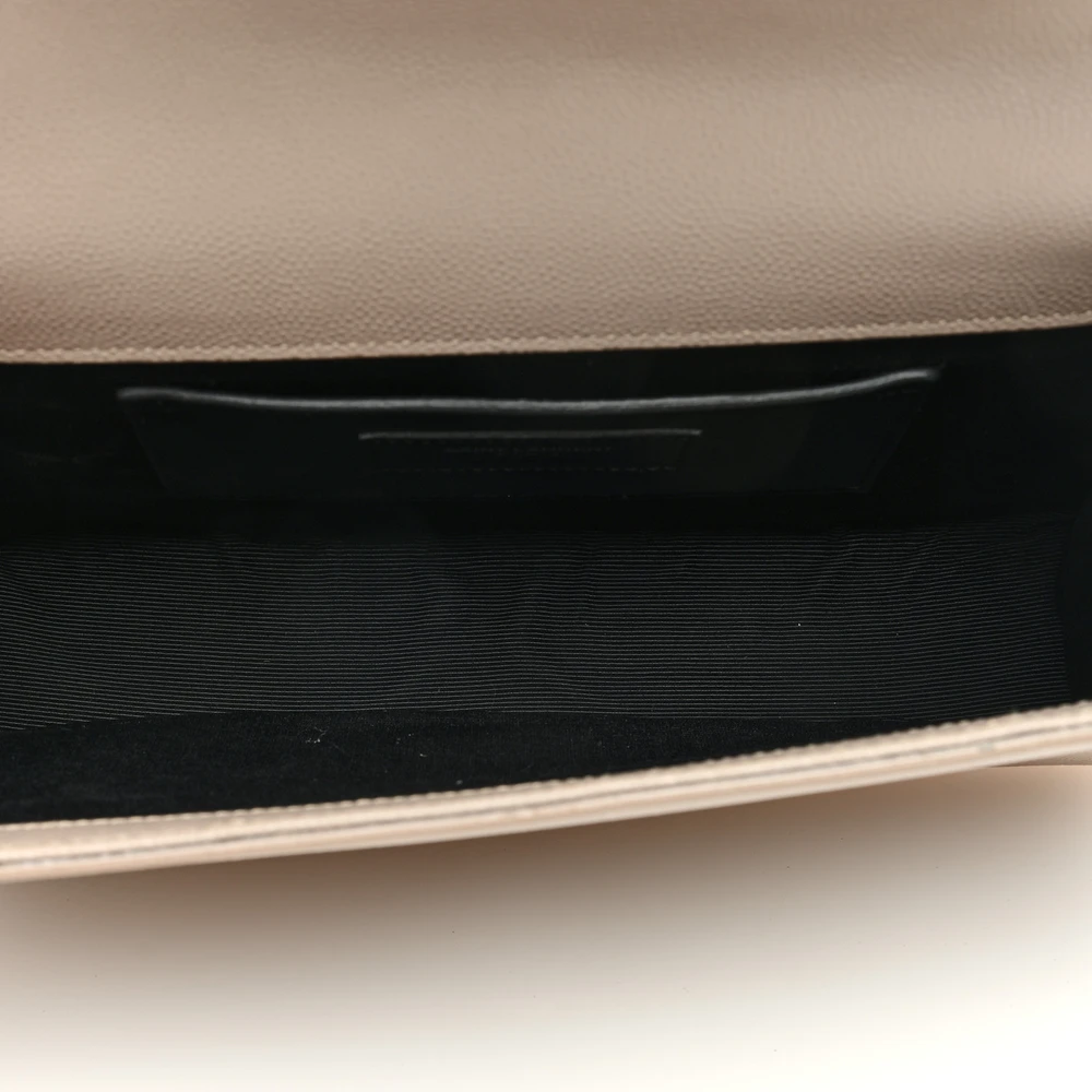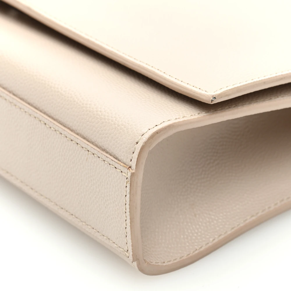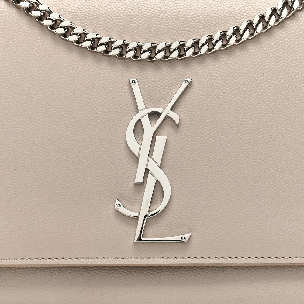 This Medium Kate Satchel in white features Monogram Grain De Poudre Leather with silver hardware. The sleek and structured design is ideal for carrying essentials in style. Its flap closure and chain strap offer practicality, while the iconic YSL logo adds timeless elegance. A versatile choice for day-to-night transitions.