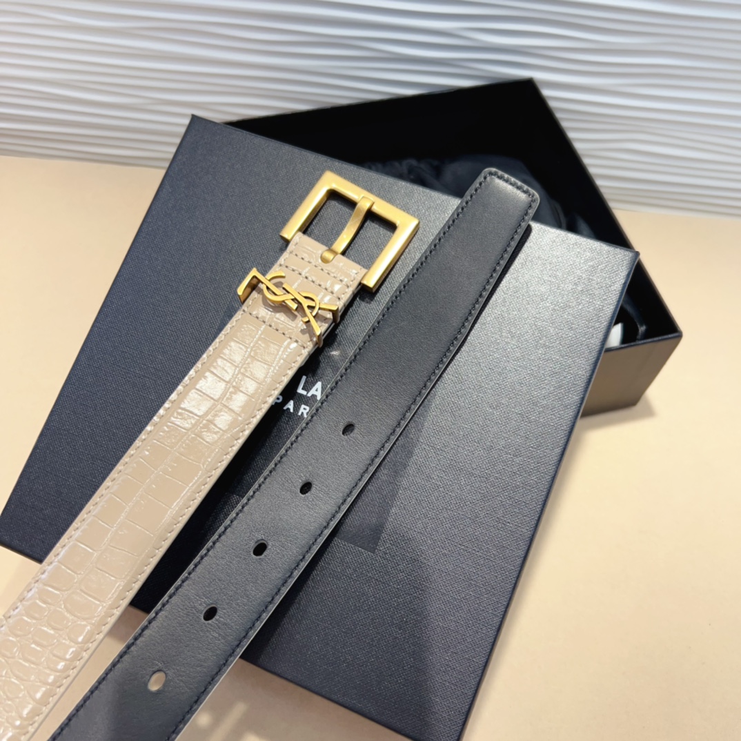 Saint Laurent Cassandre Belt In Black/Beige/Green Crocodile-Embossed Leather With Gold Hardware 30mm