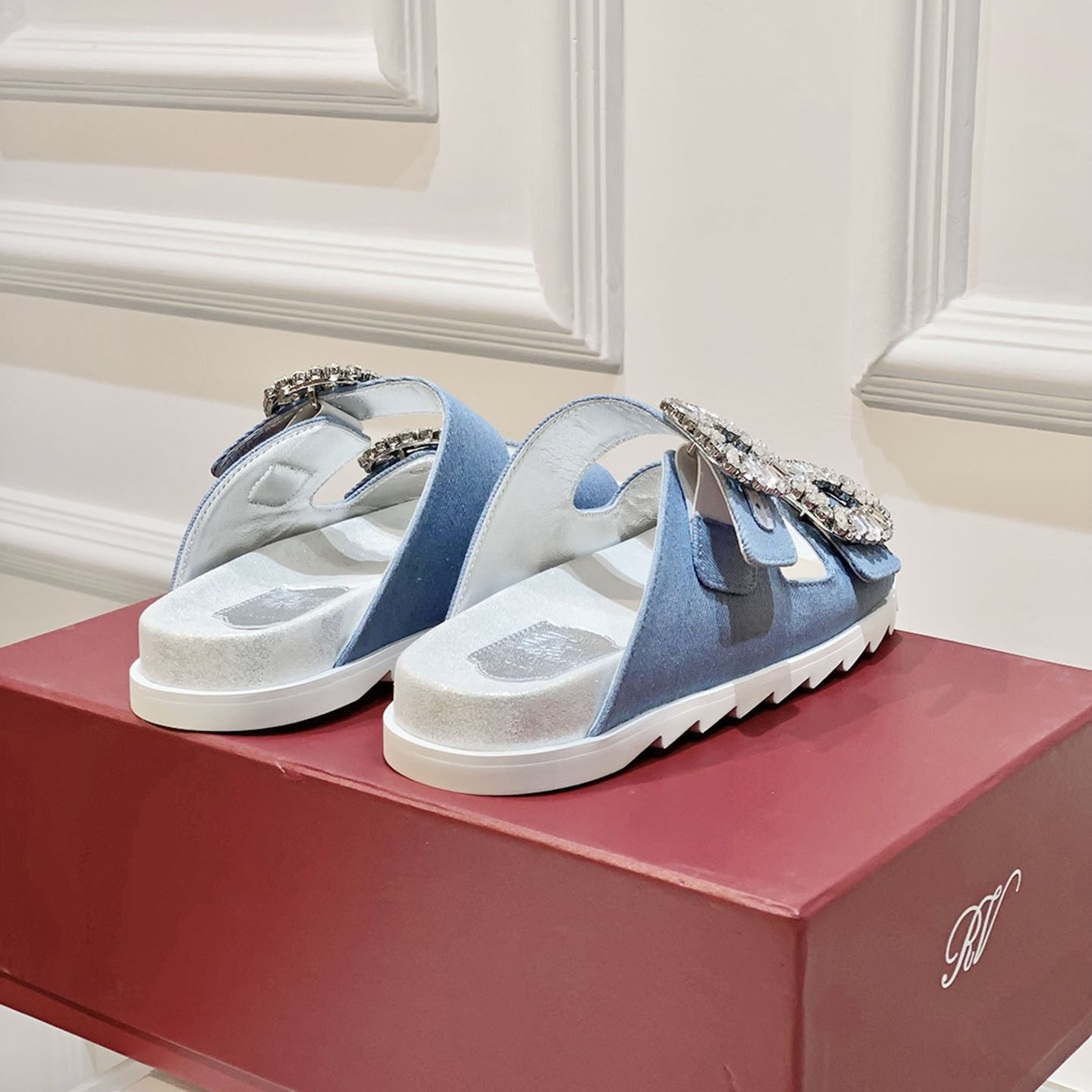 Roger Vivier Slidy Viv’ Mules Sandals In Denim Blue With Crystal Buckle