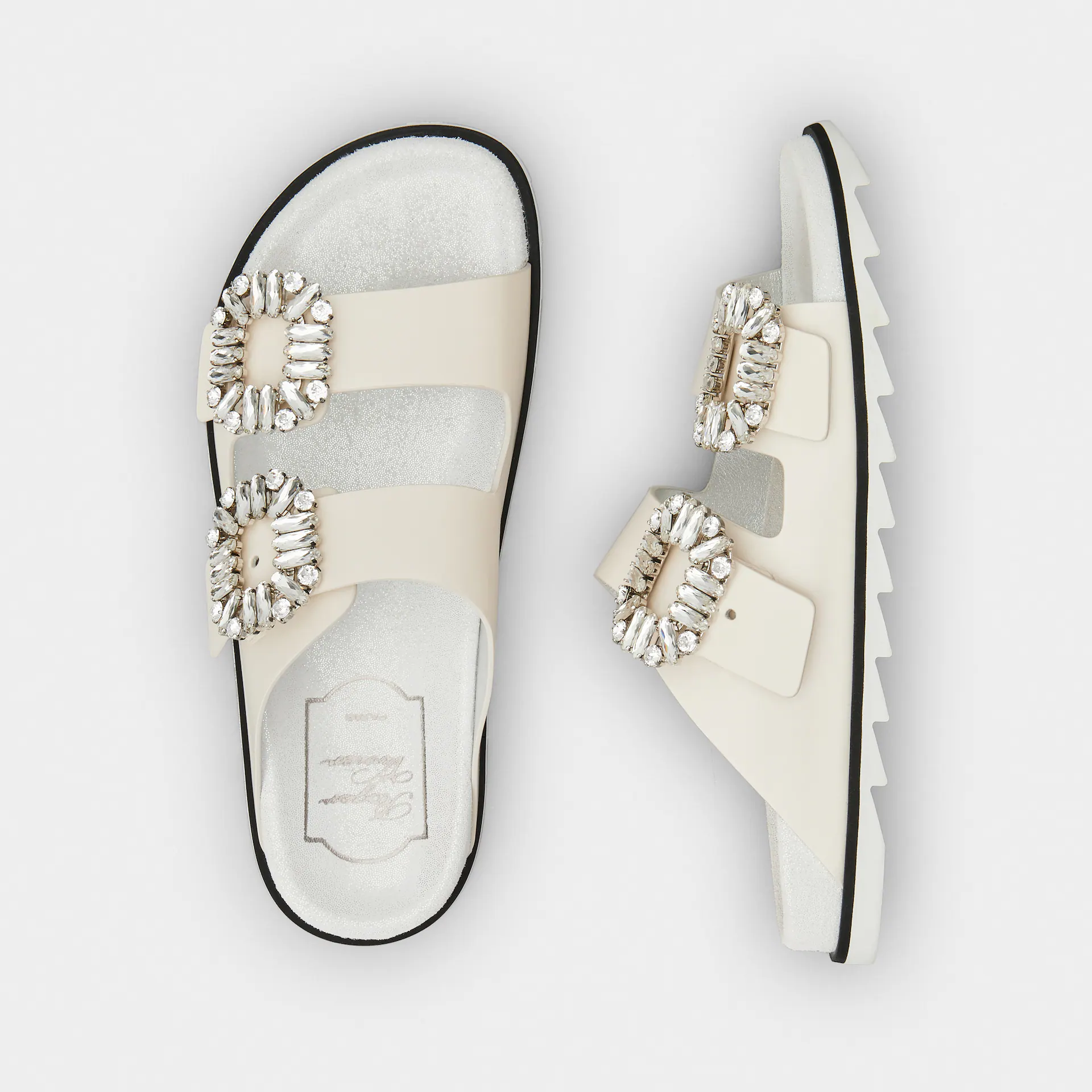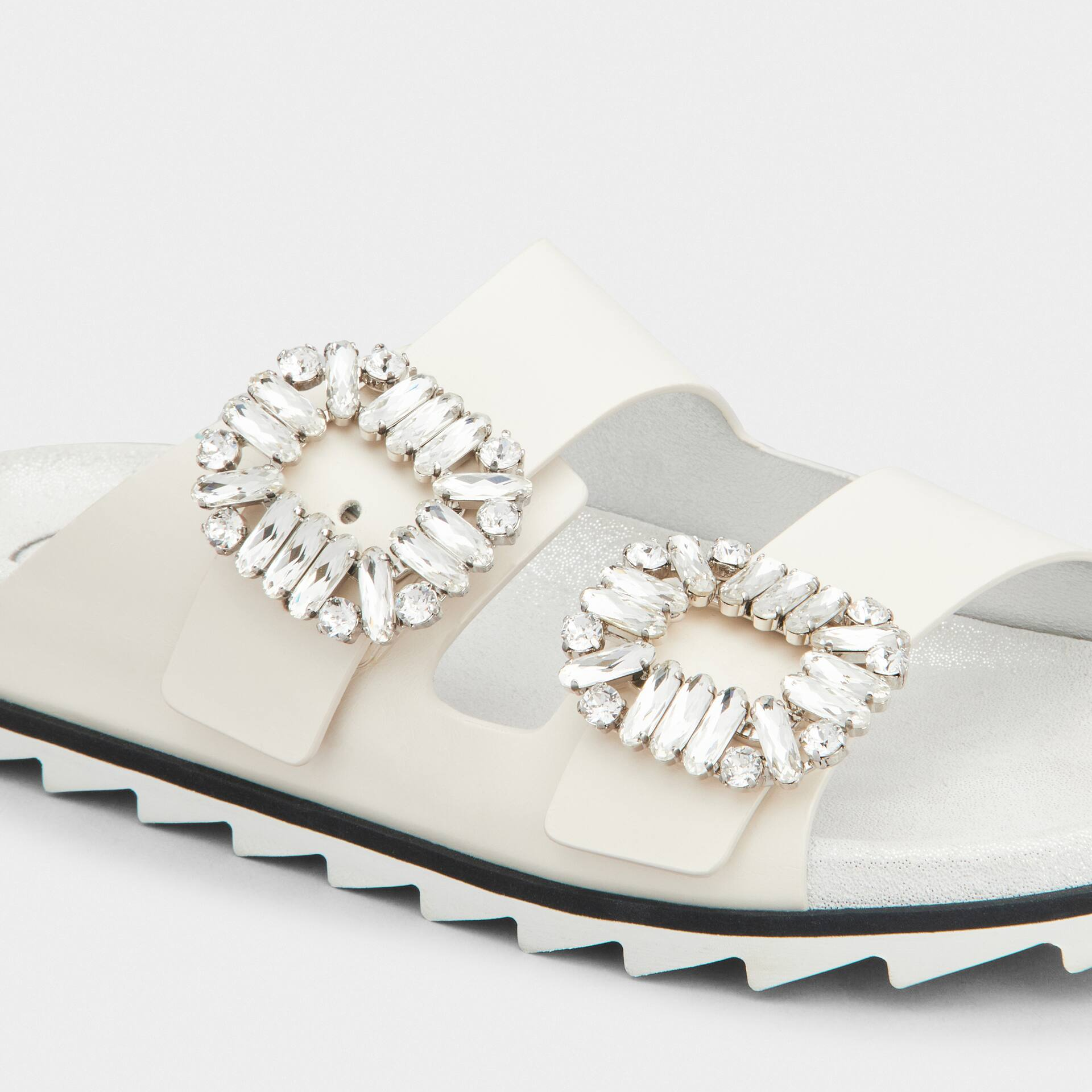• Roger Vivier Slidy Viv’ Mules Sandals In White Leather With Crystal Buckle