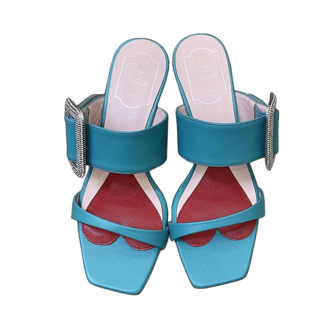 Roger Vivier Viv’ Rangers Mules Sandals In White/Black/Blue Leather With Crystal Buckle (Heel Height 5.5cm)