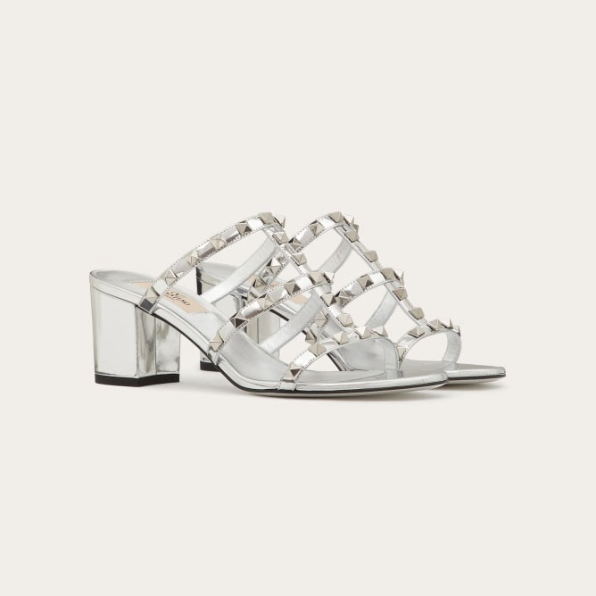 VALENTINO Silver mirror effect rivet sandals (heel height 6cm)