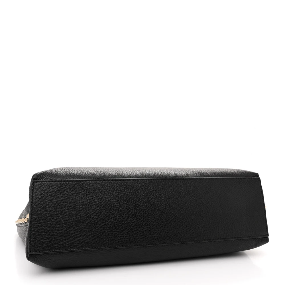 This Valentino Garavani Medium Rockstud Tote in Black/Rose Quartz is functional and chic. Made from grainy calfskin leather with gold hardware. Features a spacious interior for everyday needs. Rockstud detailing enhances its bold appeal. A versatile bag for work or leisure. Timeless and modern design.