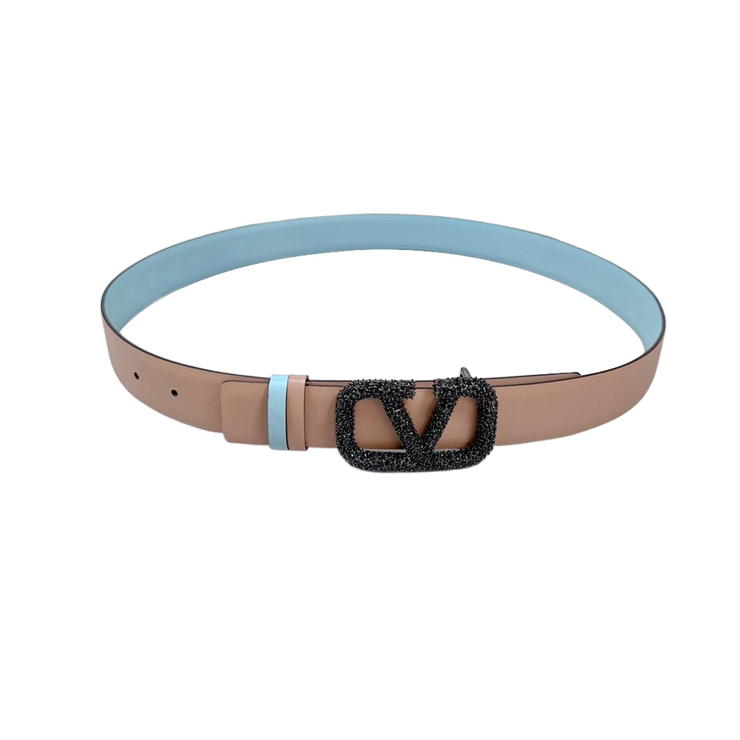 Valentino V Buckle With Crystal Belt In Nude/Blue Calfskin With Gold/Black Hardware 30mm